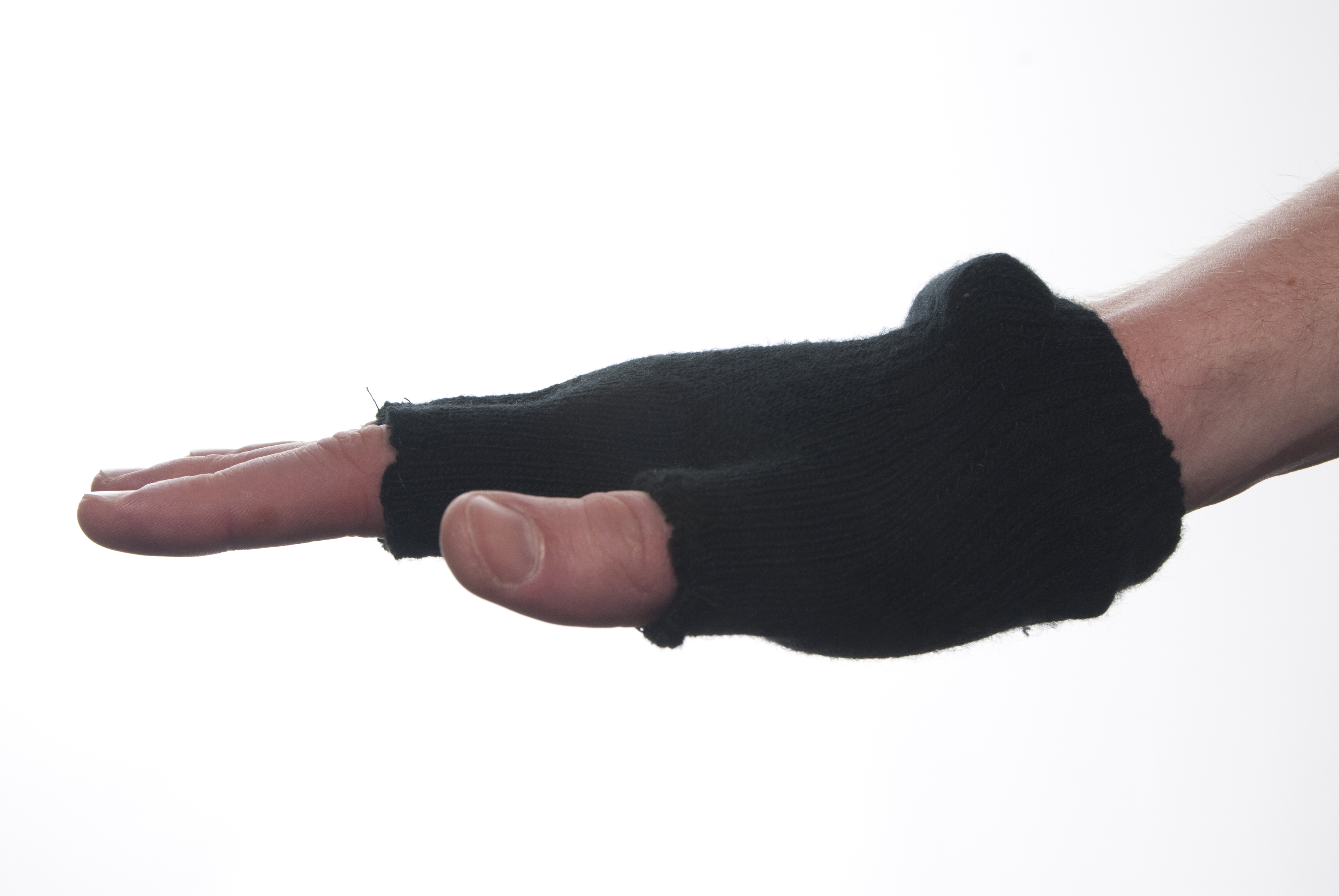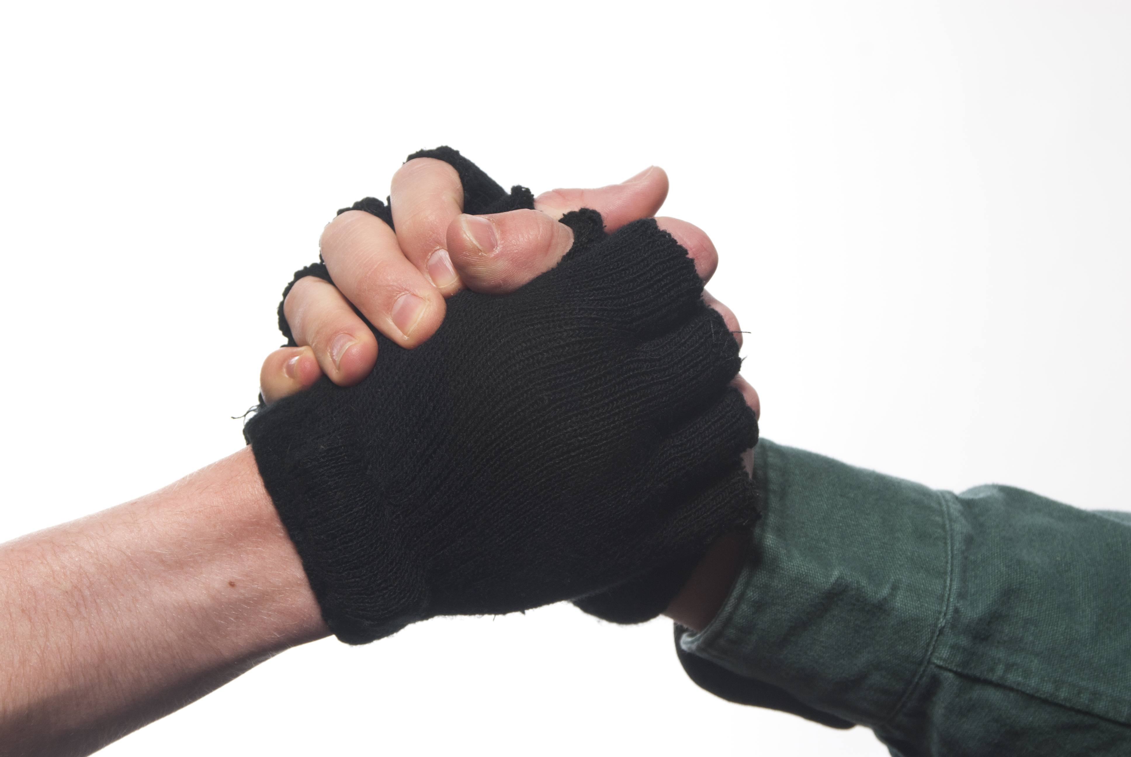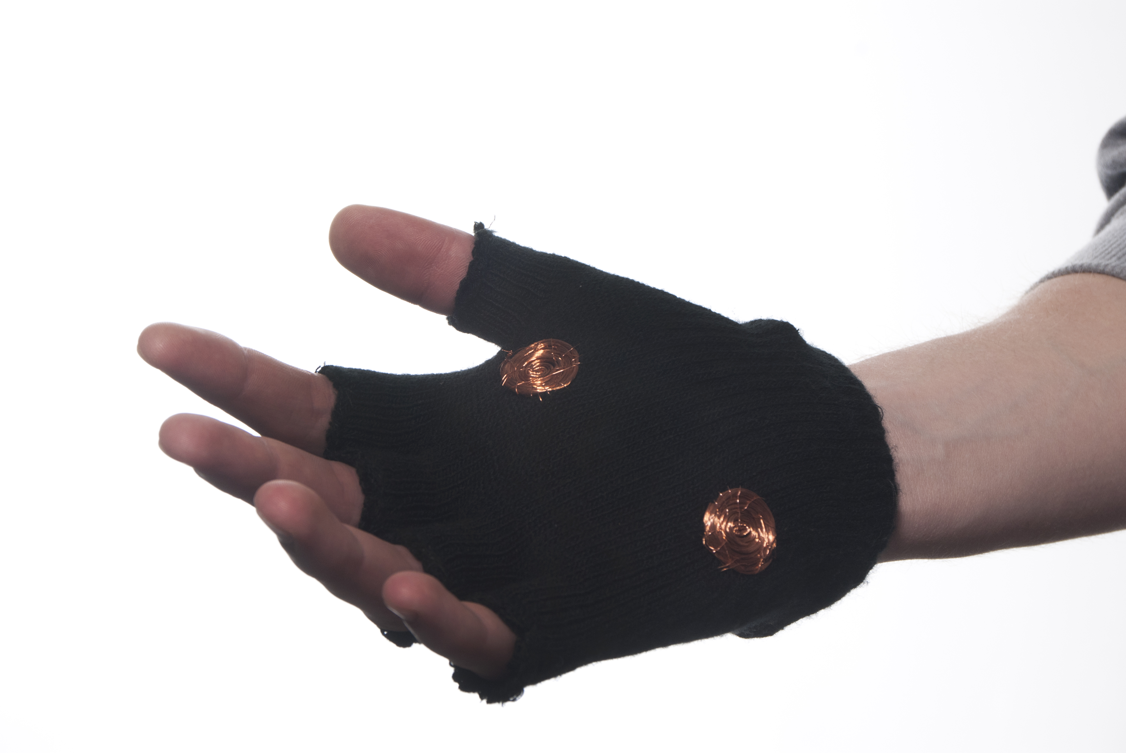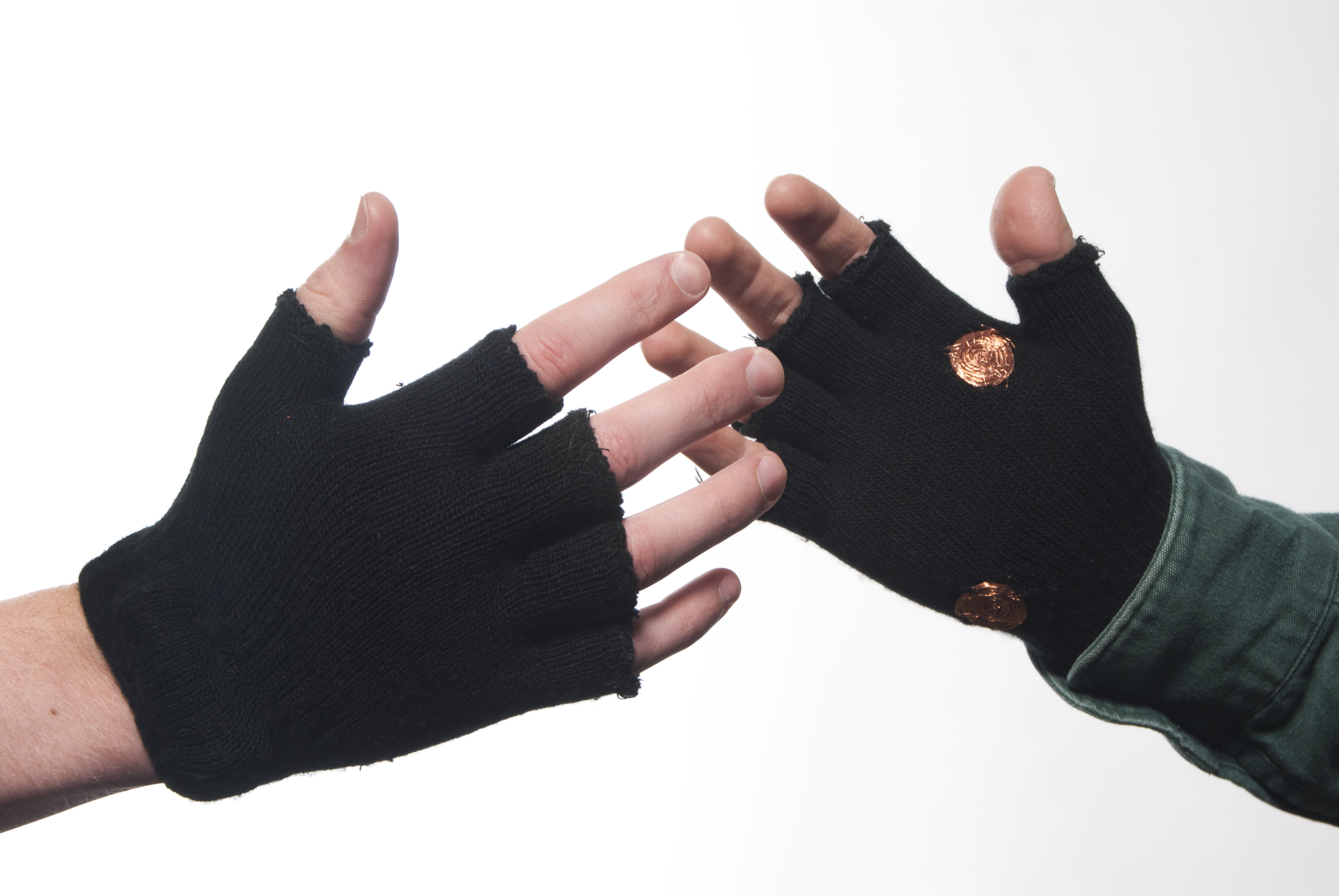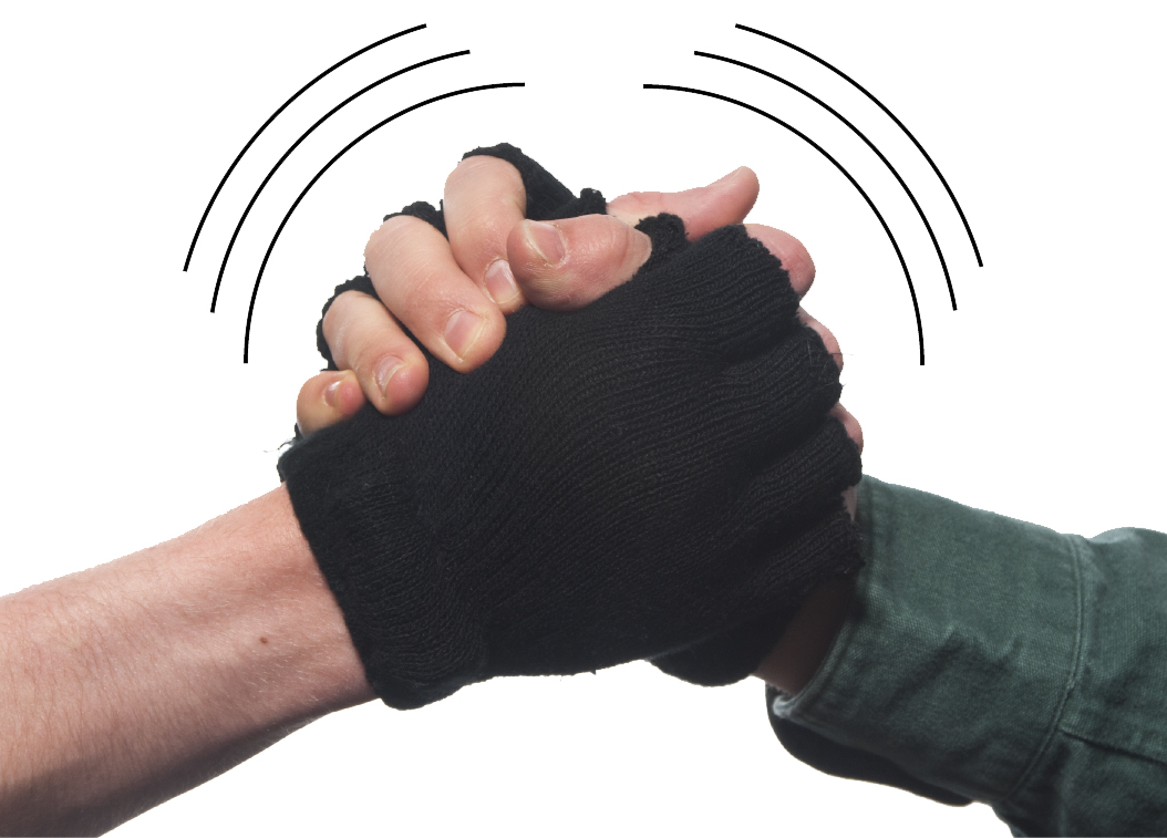 Vibration receptors in the body enable the sensory of touch. Magnifying the vibration felt during a touching interaction should give a perceived enhanced sense of touch. These gloves do just that. Each glove is wired with cellular phone vibration motors, their own batteries, and copper pads. When two people are wearing these gloves and shake hands the copper pads touch, the circuit becomes complete, and the vibrating motors are triggered. The motors are located near the inner wrist of each glove, the most sensitive part of the hand. More than anything, this Art School project helped teach me the art of story telling.