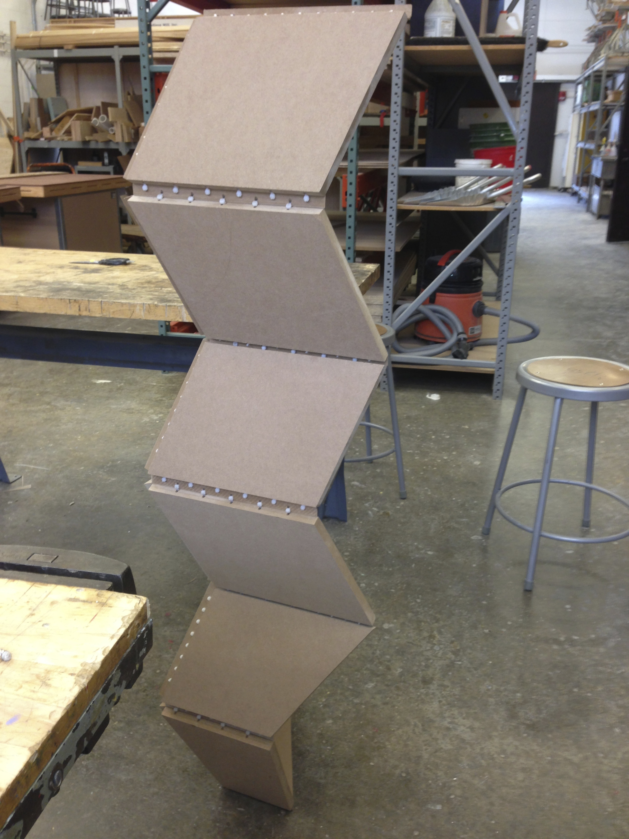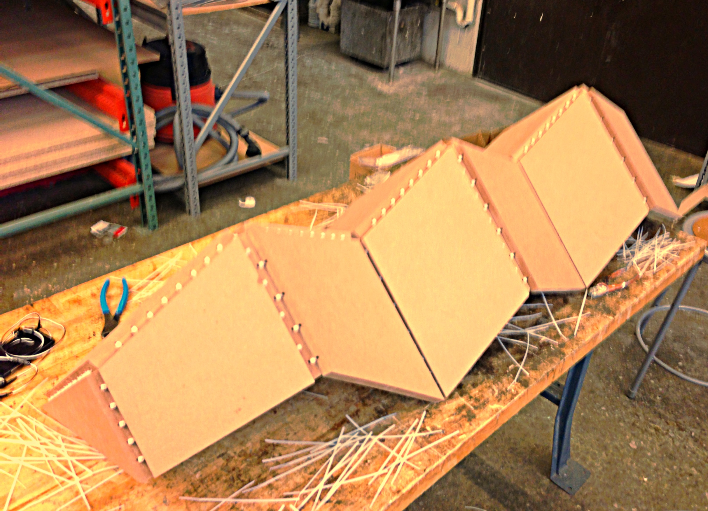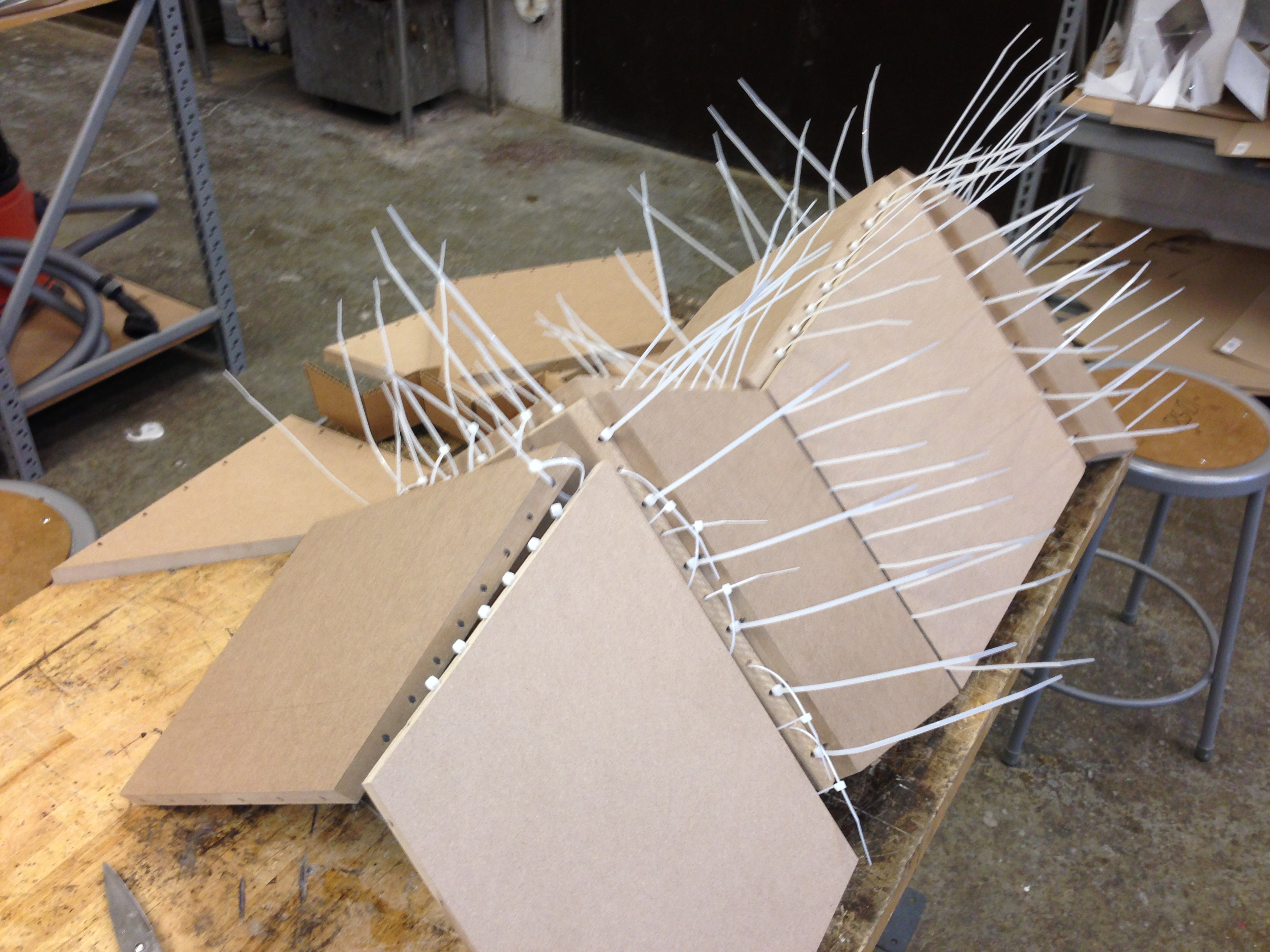 This project was the result of a challenge to create a piece of furniture from a single 4' x 4' Medium Density Fiberboard sheet. I had seen zip ties used in furniture design in some corner of the internet previously, and wanted to test the unconventional joining method myself. The outcome was a geometric shelving unit. The zipties held the structure together pretty well initially, but over the last few years they have begun to sag under the weight of the MDF.