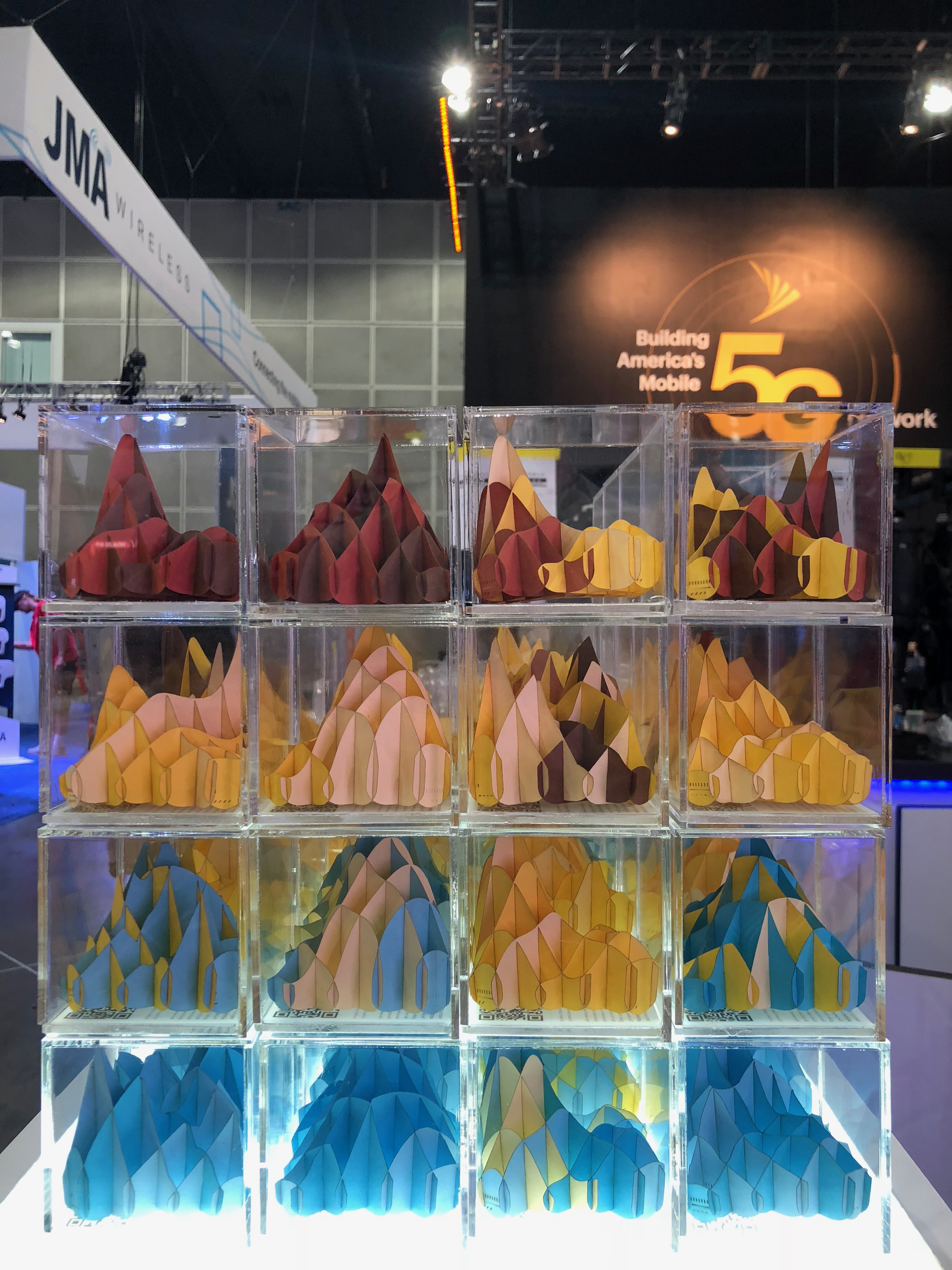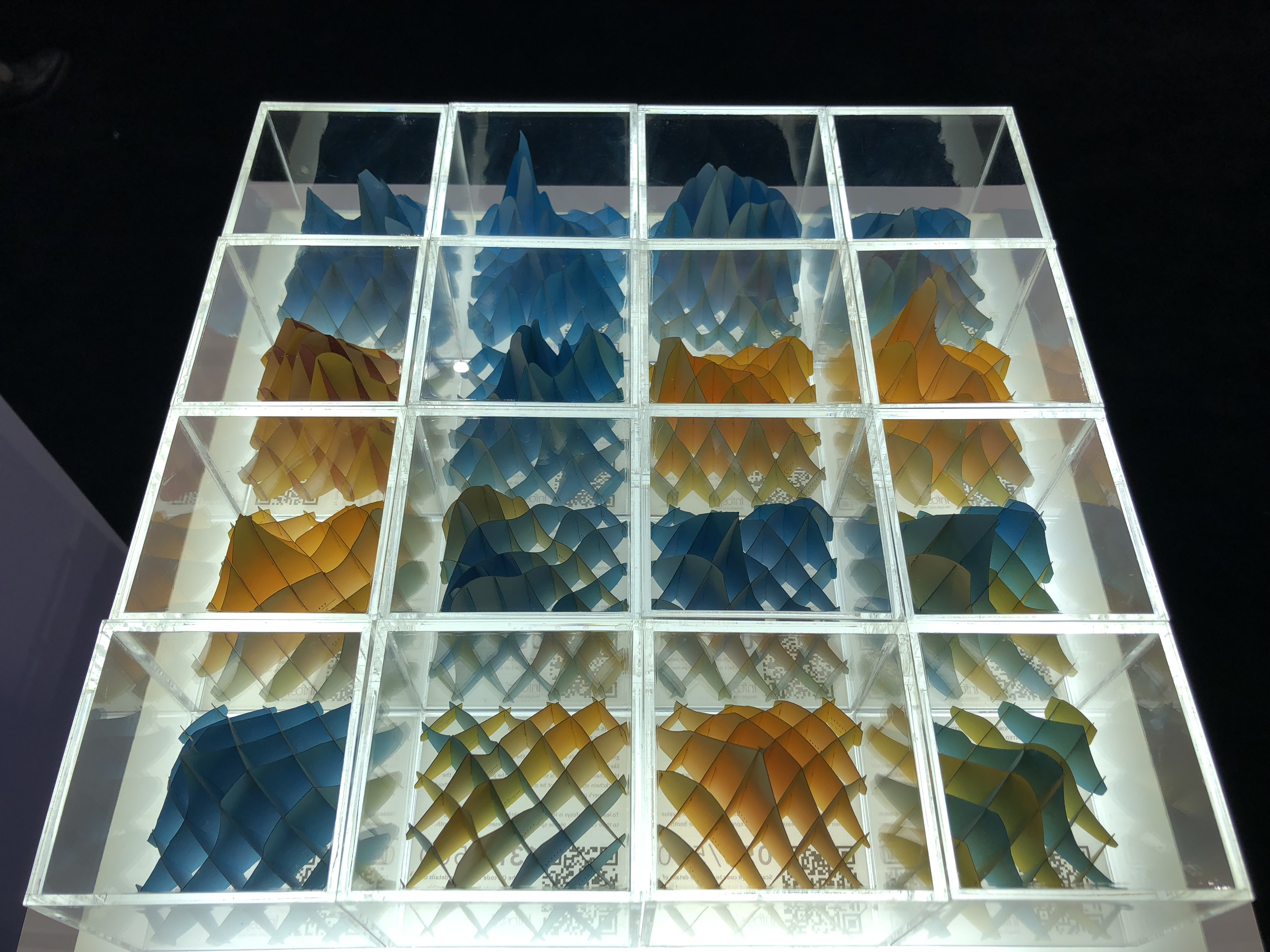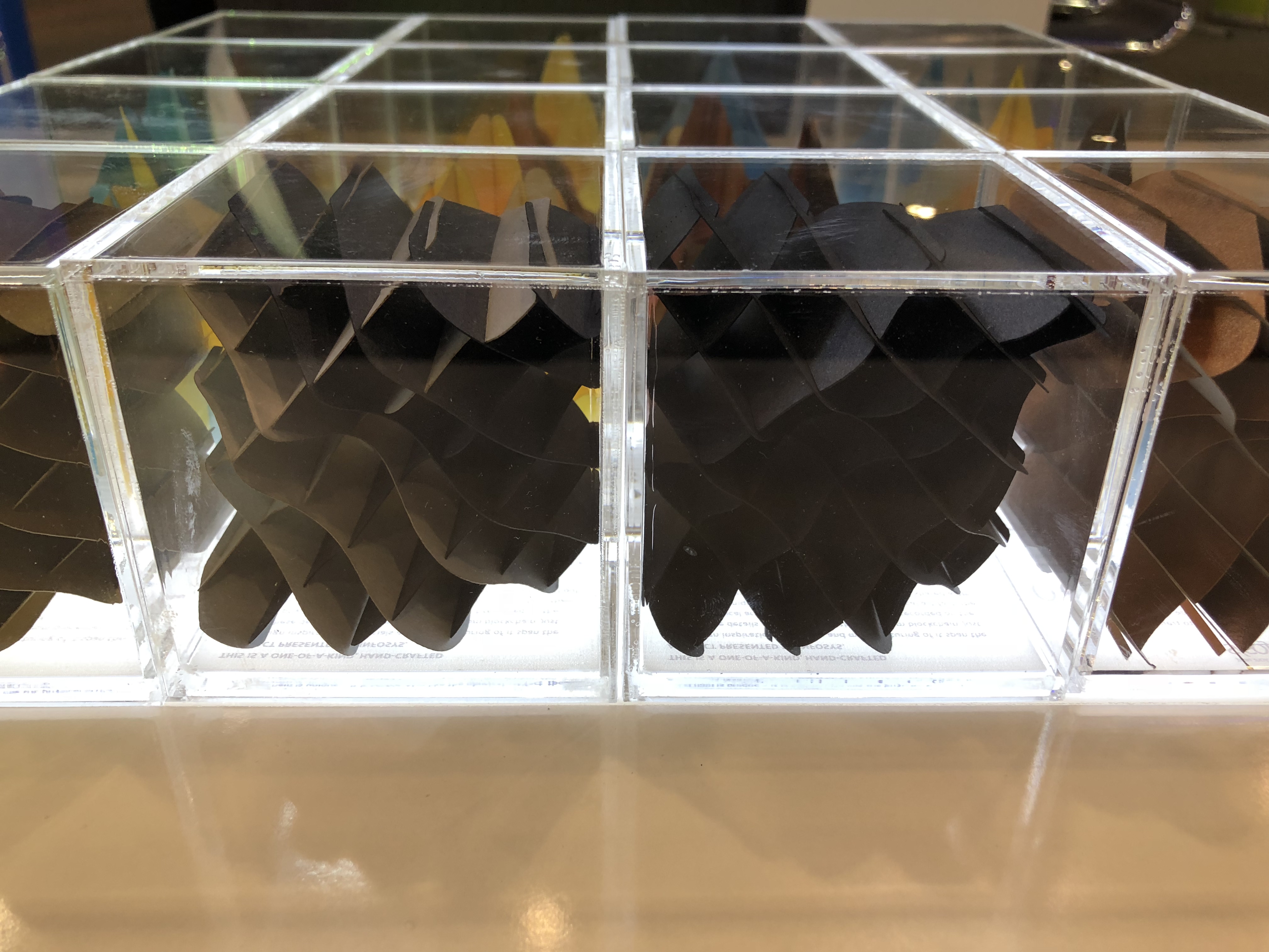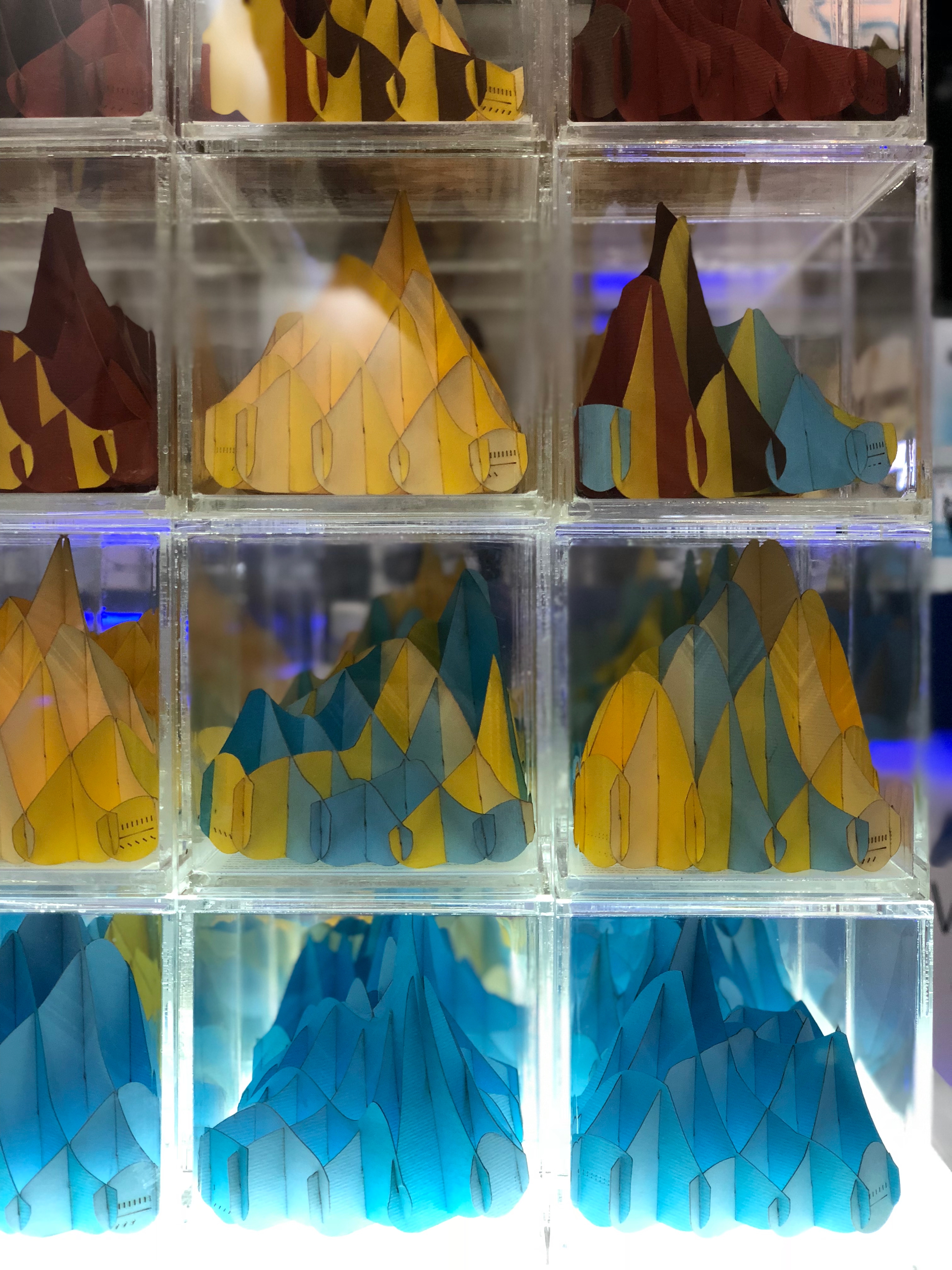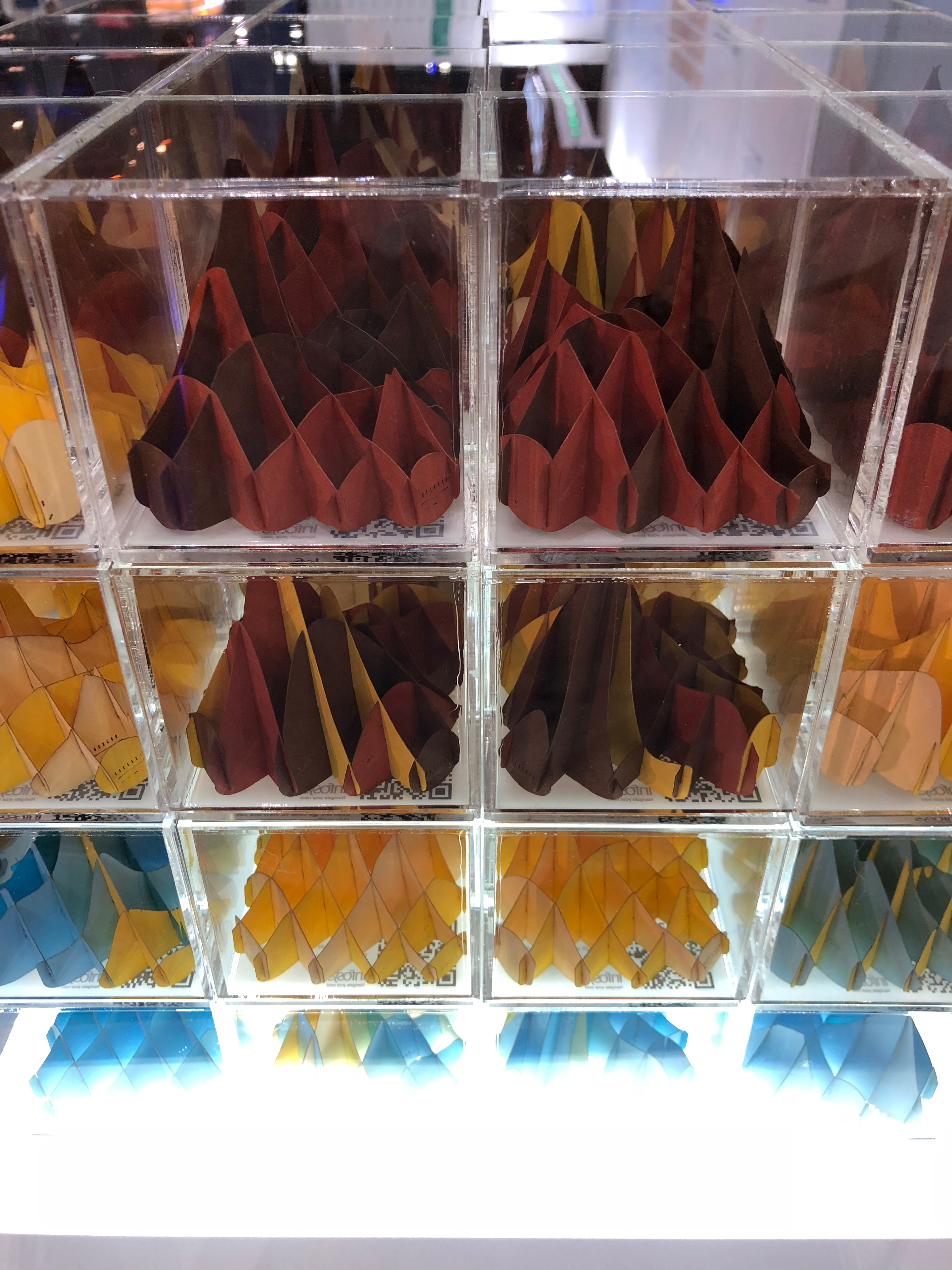 From Colombia, I traveled with the 500 assembled origami artifacts to Boston for packaging in acrylic. From a display perspective, we felt housing these in acrylic would make them feel more like artifacts, museum-exhibit-esque. The acrylic didn't turn out exactly as we had planned, so there was a last minute rush of adjusting components for everything to fit together, and achieve the aesthetic we intended. Shortly after packaging was complete, I brought them on the road to preach the word of digital scarcity.