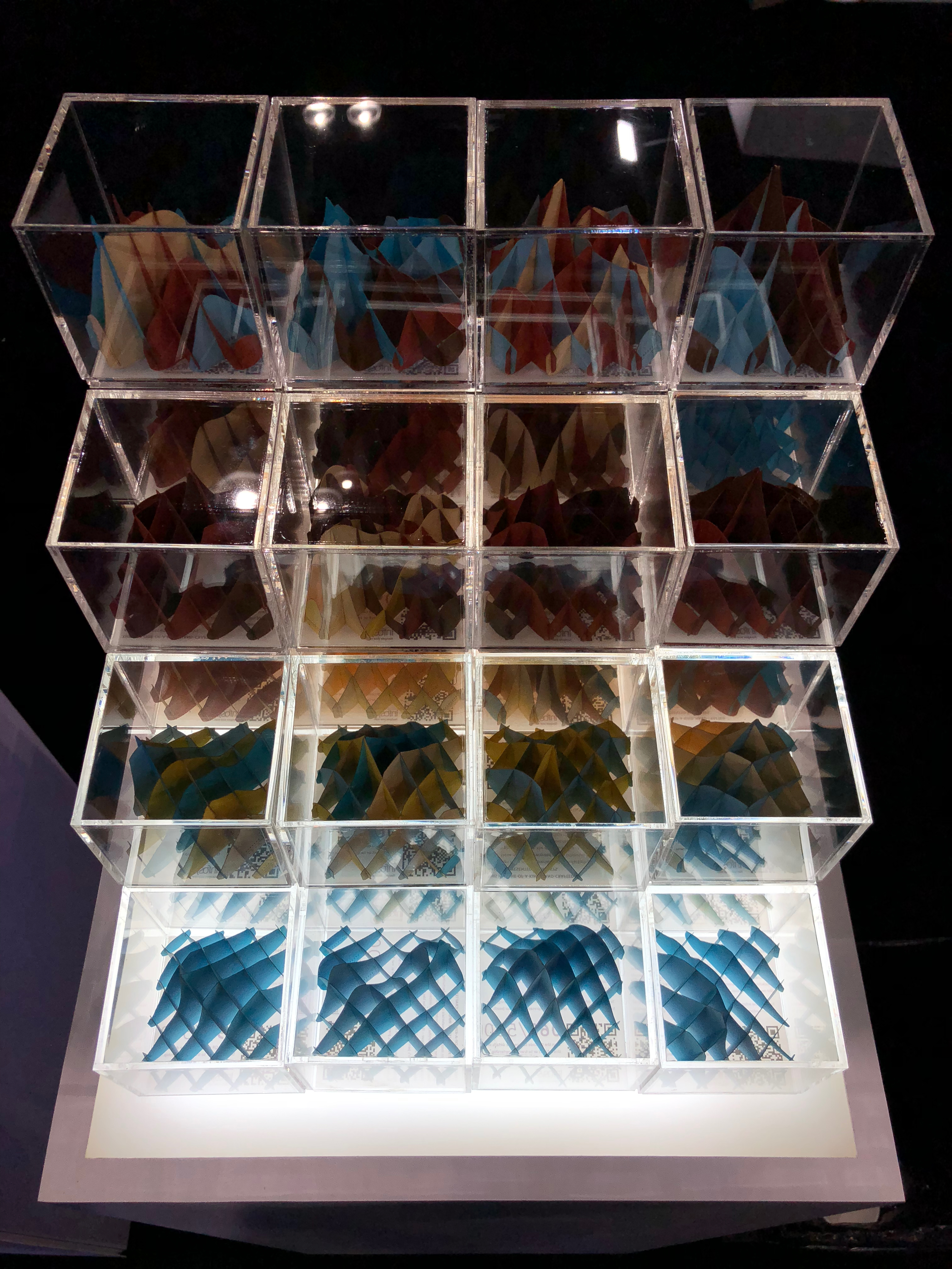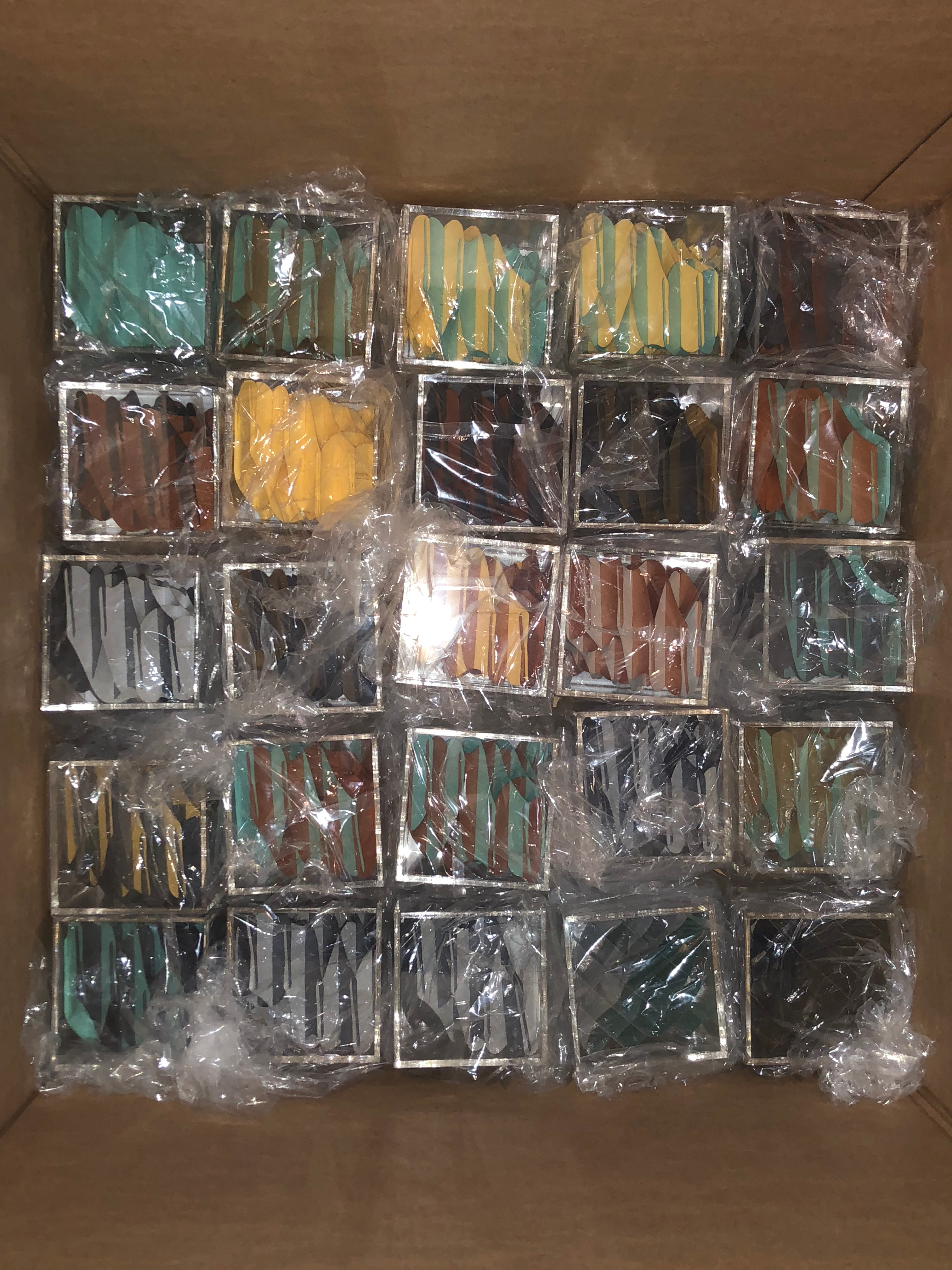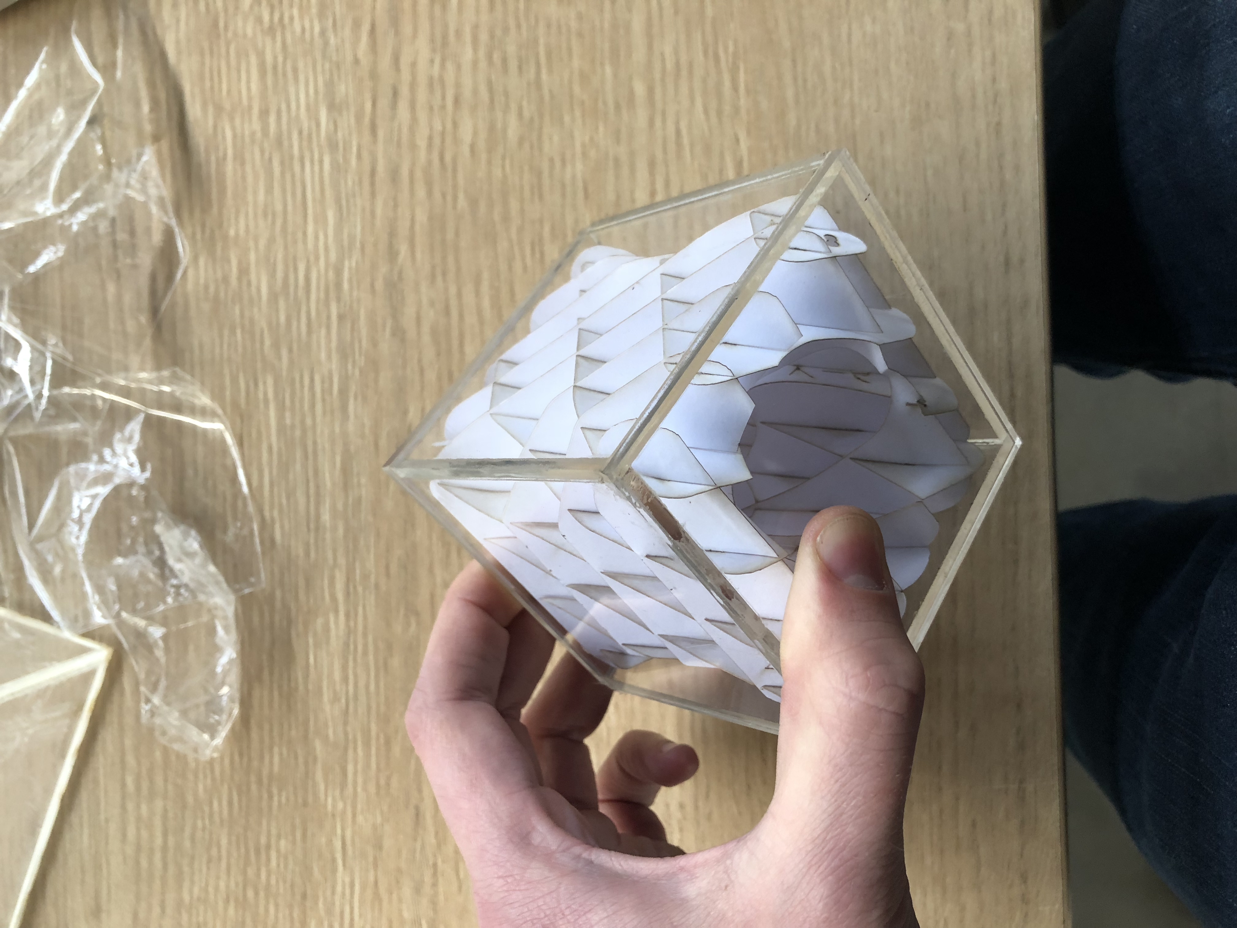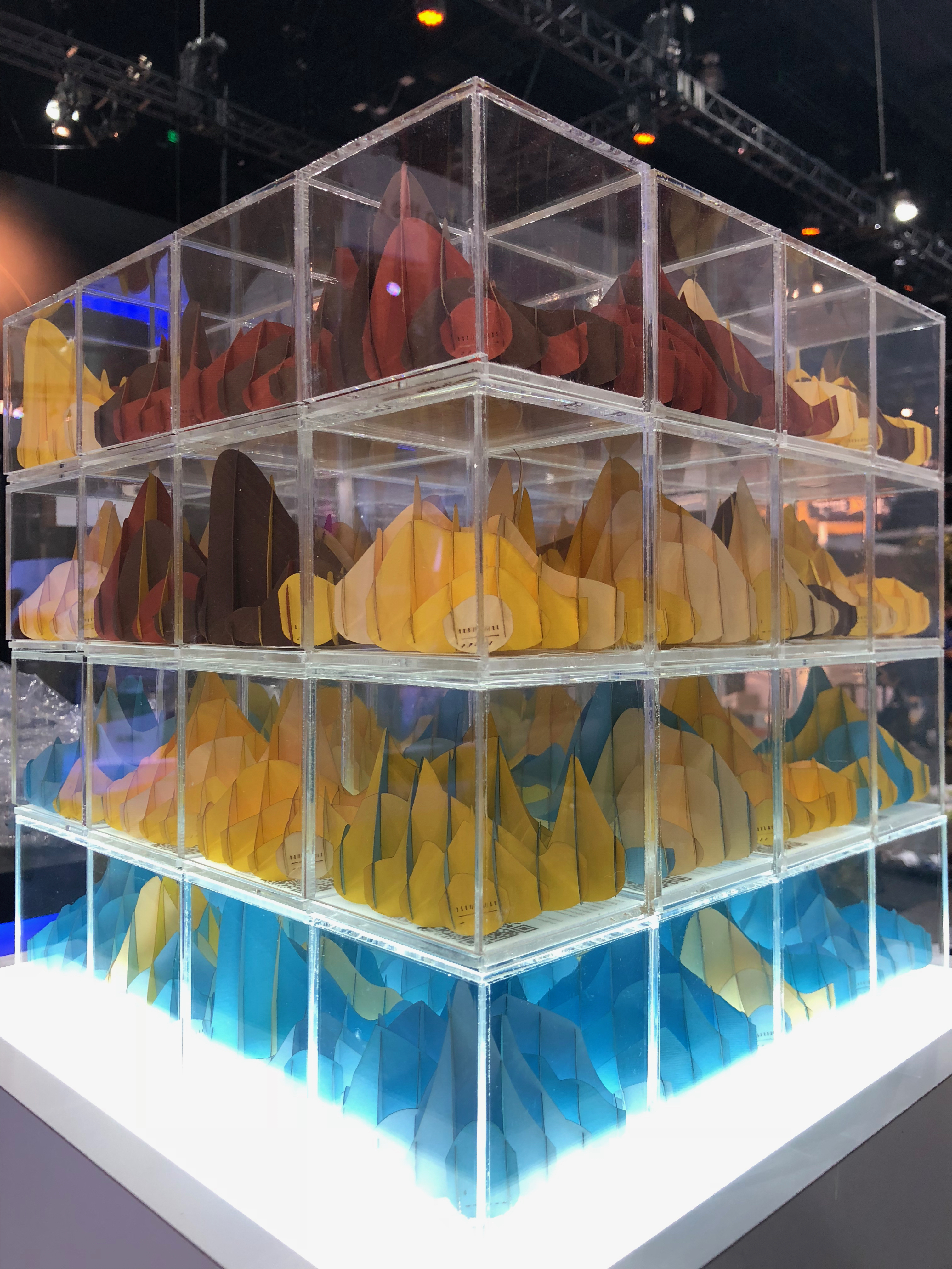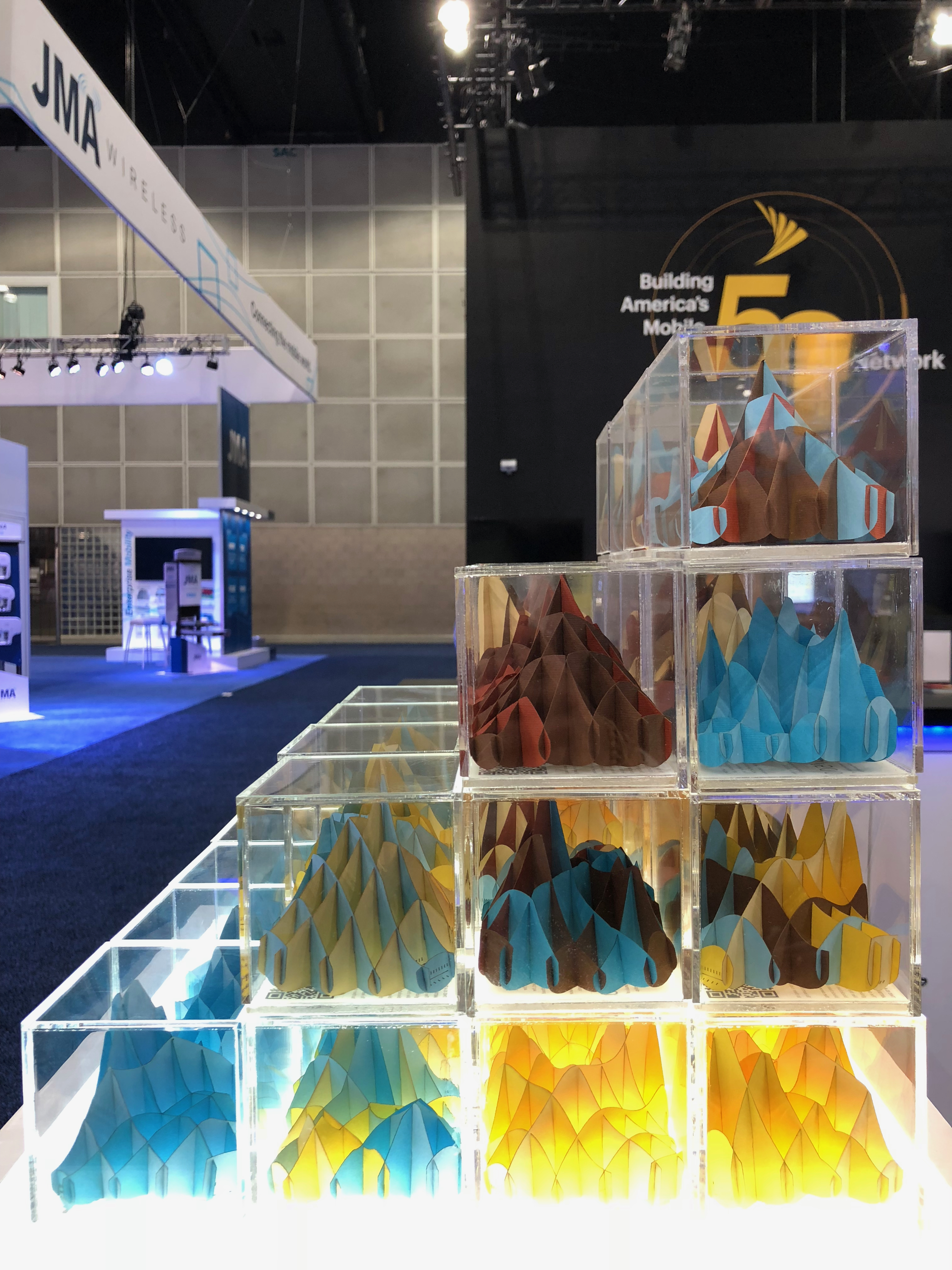 From Colombia, I traveled with the 500 assembled origami artifacts to Boston for packaging in acrylic. From a display perspective, we felt housing these in acrylic would make them feel more like artifacts, museum-exhibit-esque. The acrylic didn't turn out exactly as we had planned, so there was a last minute rush of adjusting components for everything to fit together, and achieve the aesthetic we intended. Shortly after packaging was complete, I brought them on the road to preach the word of digital scarcity.