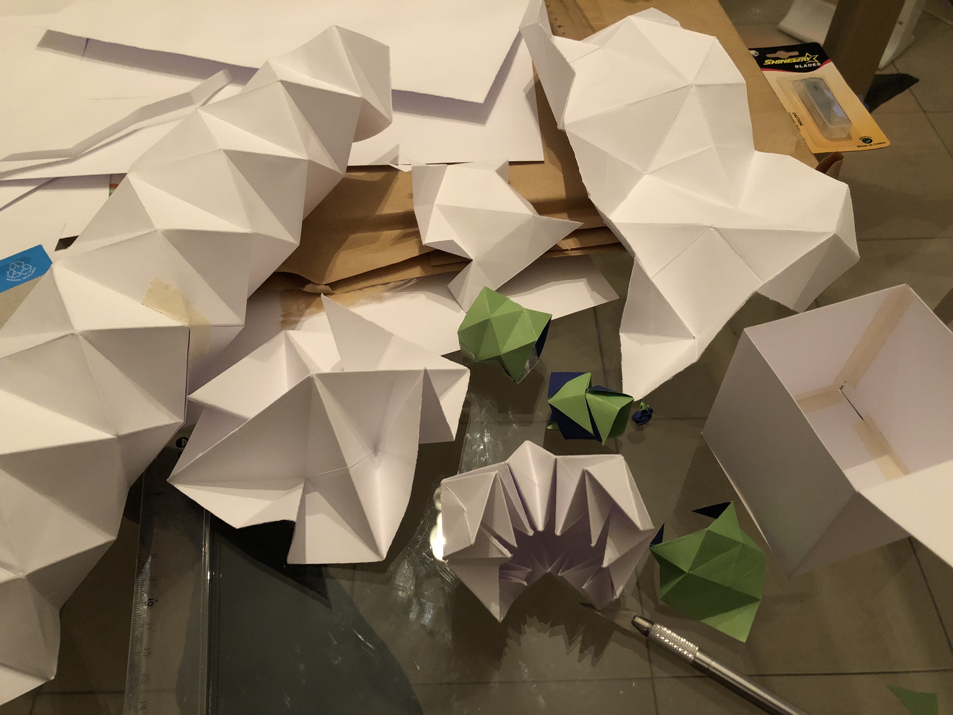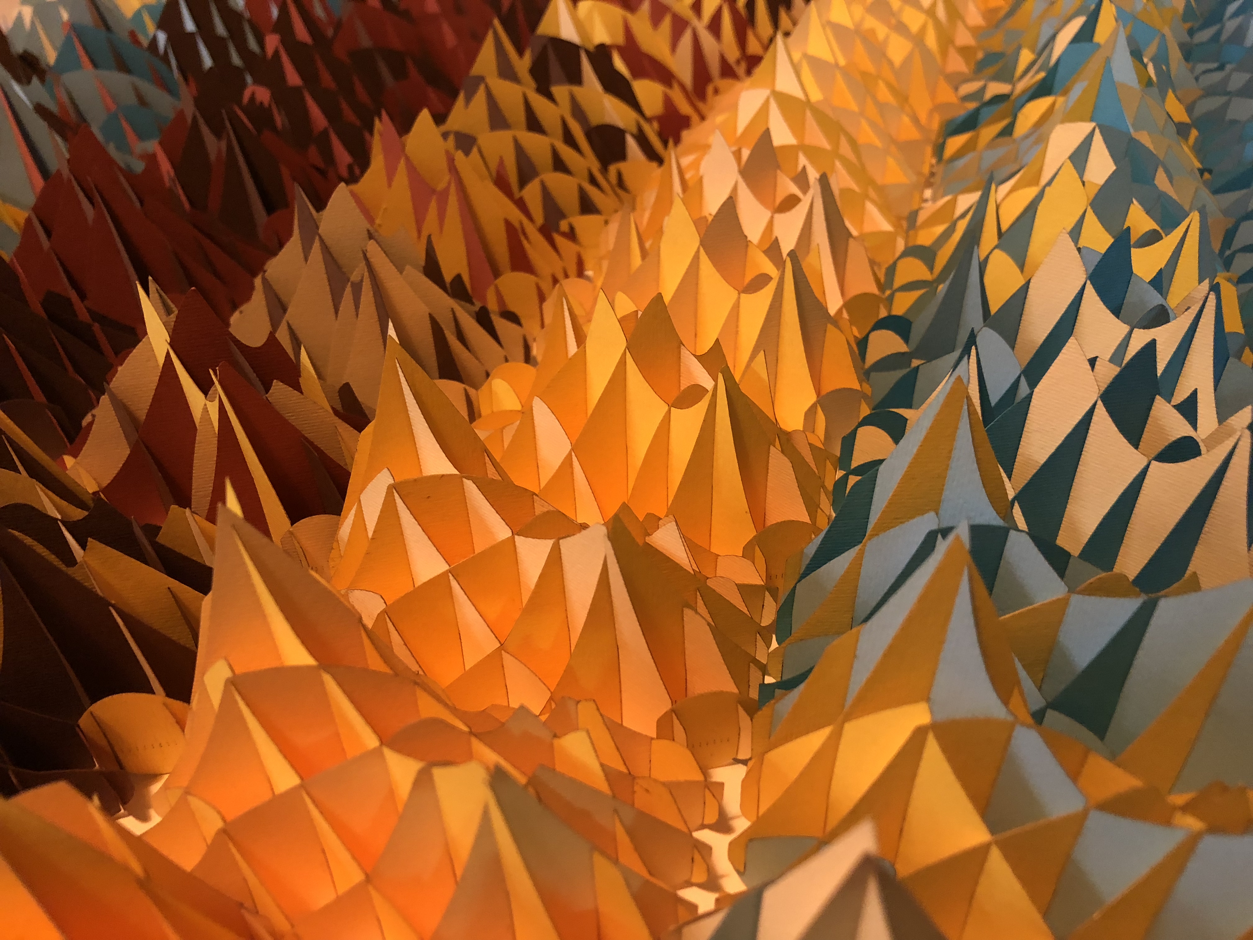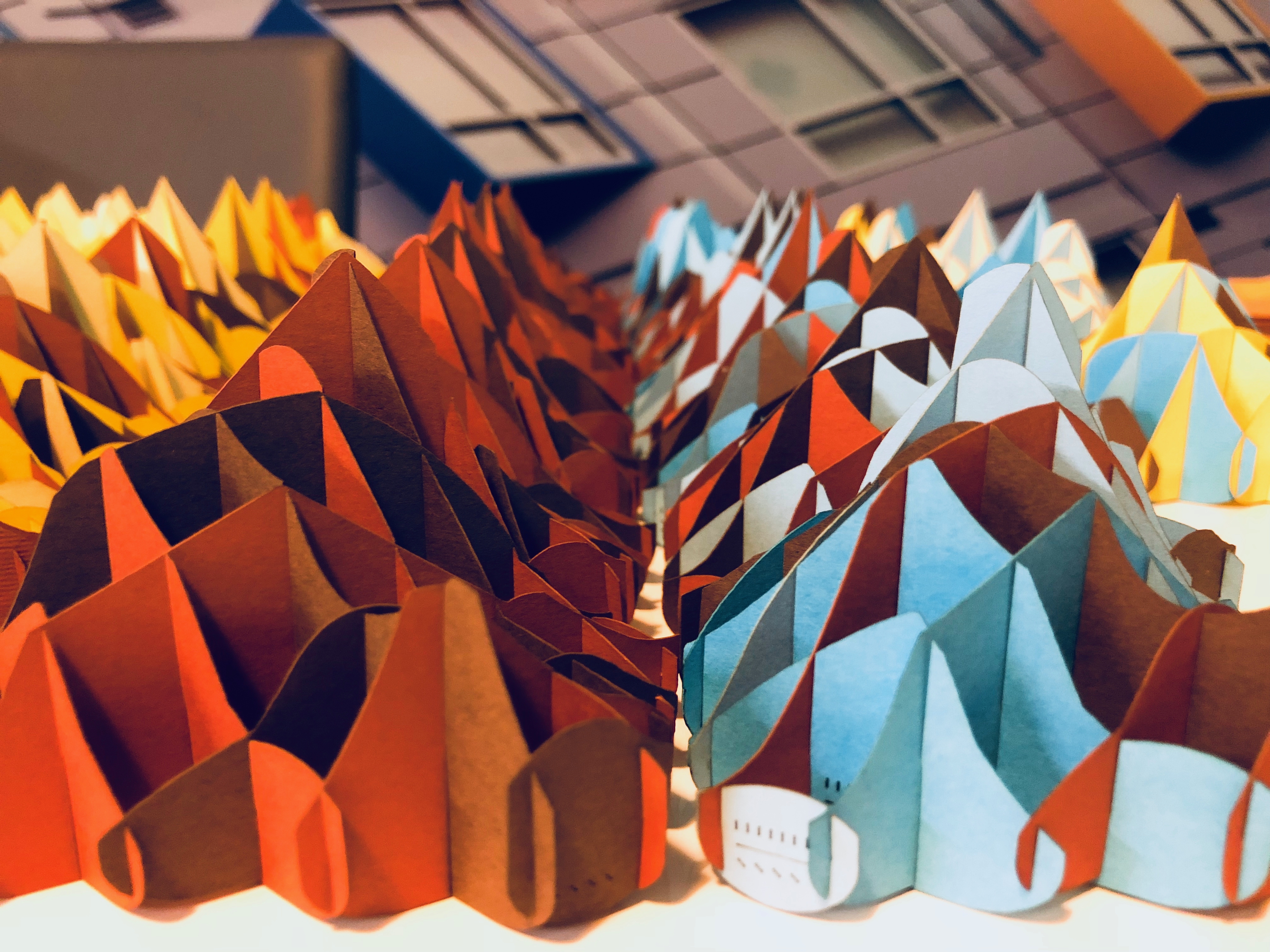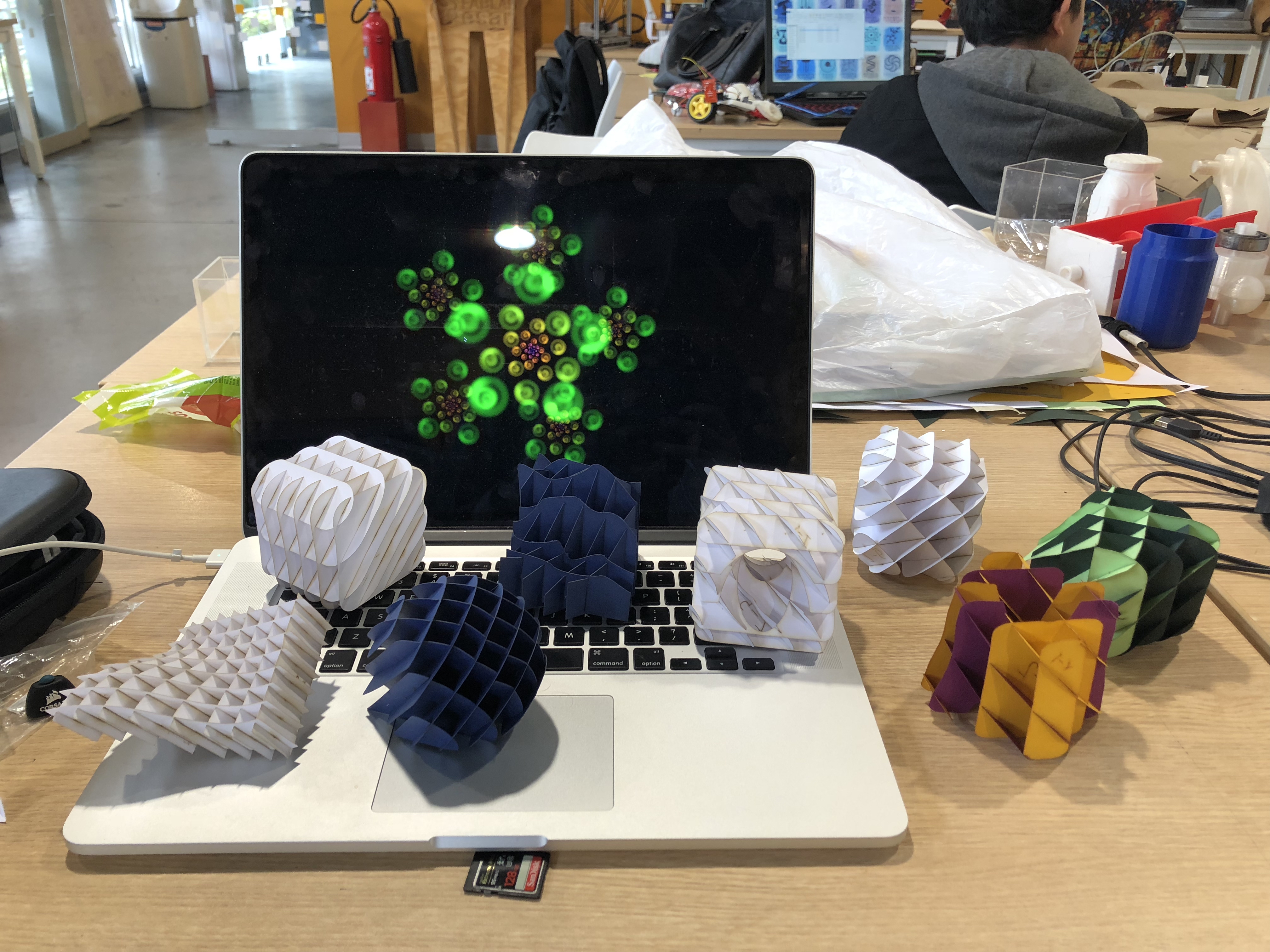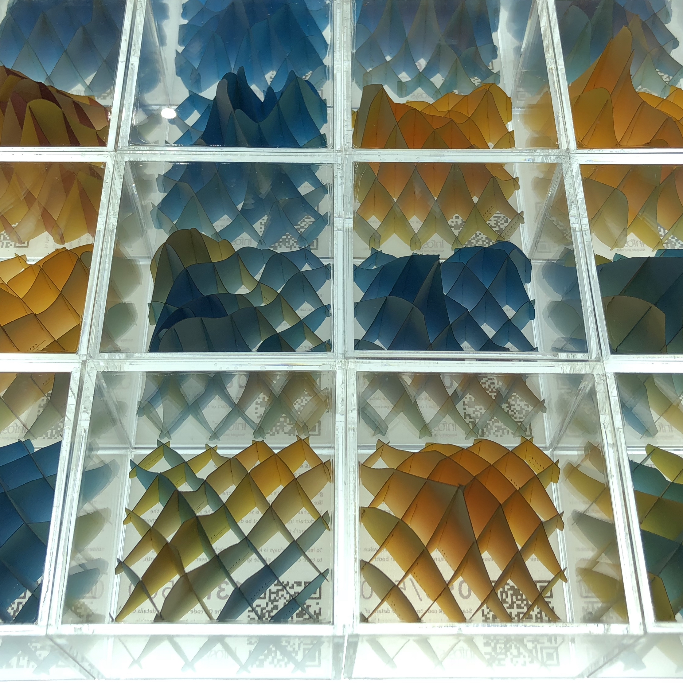 At the time, I had recently left my job to travel and freelance with a creative crew of folks. My friend, Chris, and I were exploring the Atacama Desert of northern Chile, while thinking about this project. The landscape ultimately had a large influence on the designs and color pallet of our artifacts. We chose origami as the unique physical artifact, it has a hand-assembled quality that emphasizes its uniqueness and physical nature. The experience required 500 pieces of origami, which posed an interesting design challenge for assembly and transportation while traveling. Developing 500 unique and appealing designs alone was tough, ensuring they also met this design criteria added another layer of complexity. Sliceform-origami allowed us to achieve a diverse set of designs we liked, while still packing flat for transportation. The majority of our experimentation and testing took place in Lima, Peru; ESAN University allowed us to prototype with the laser cutter in their fab lab. A small local laser cutting studio in Lima helped us with the massive amount of cutting required. The yellow sheet of paper to the right took about 2 hours to cut and yielded enough for 10 origami pieces.