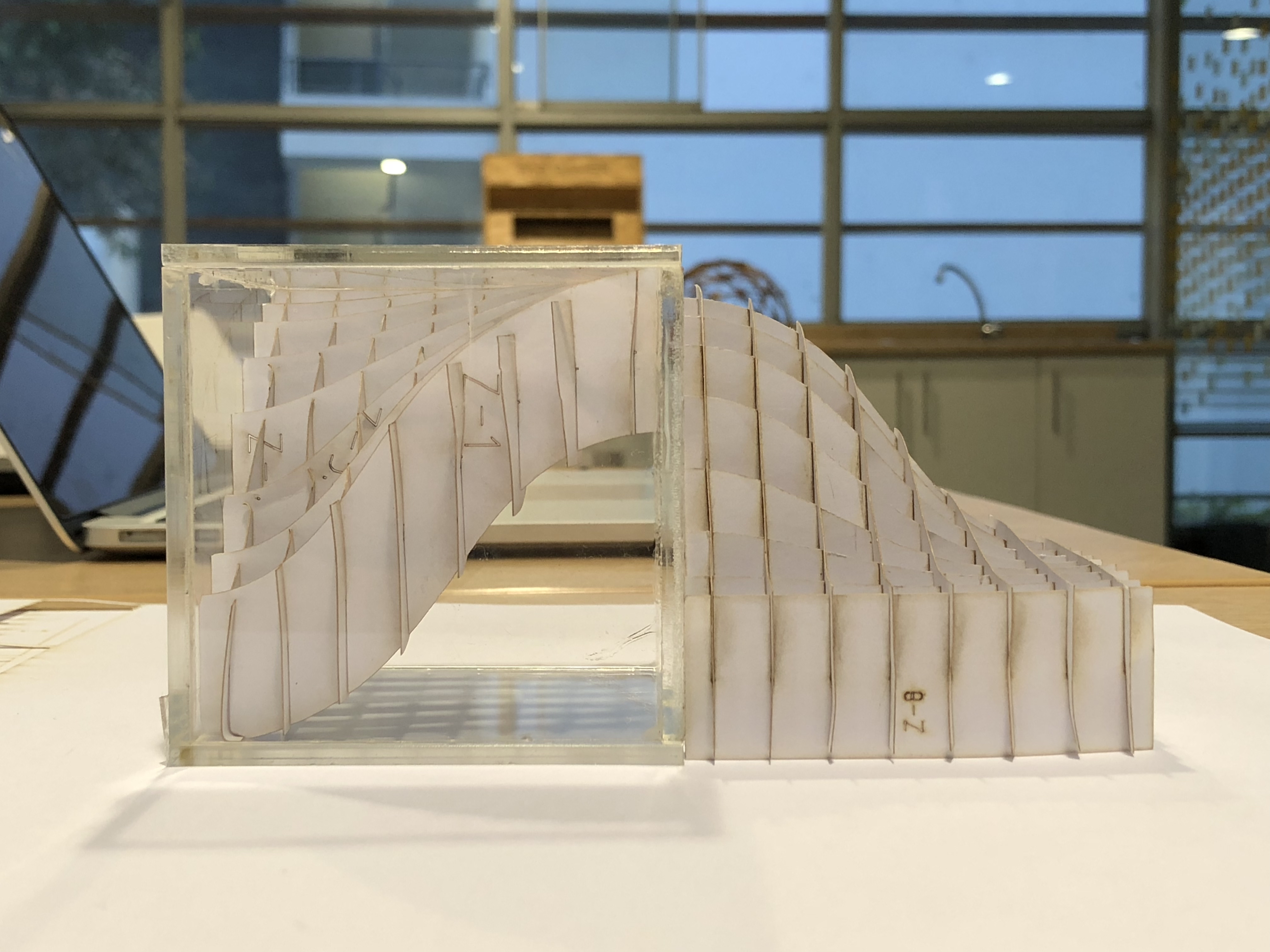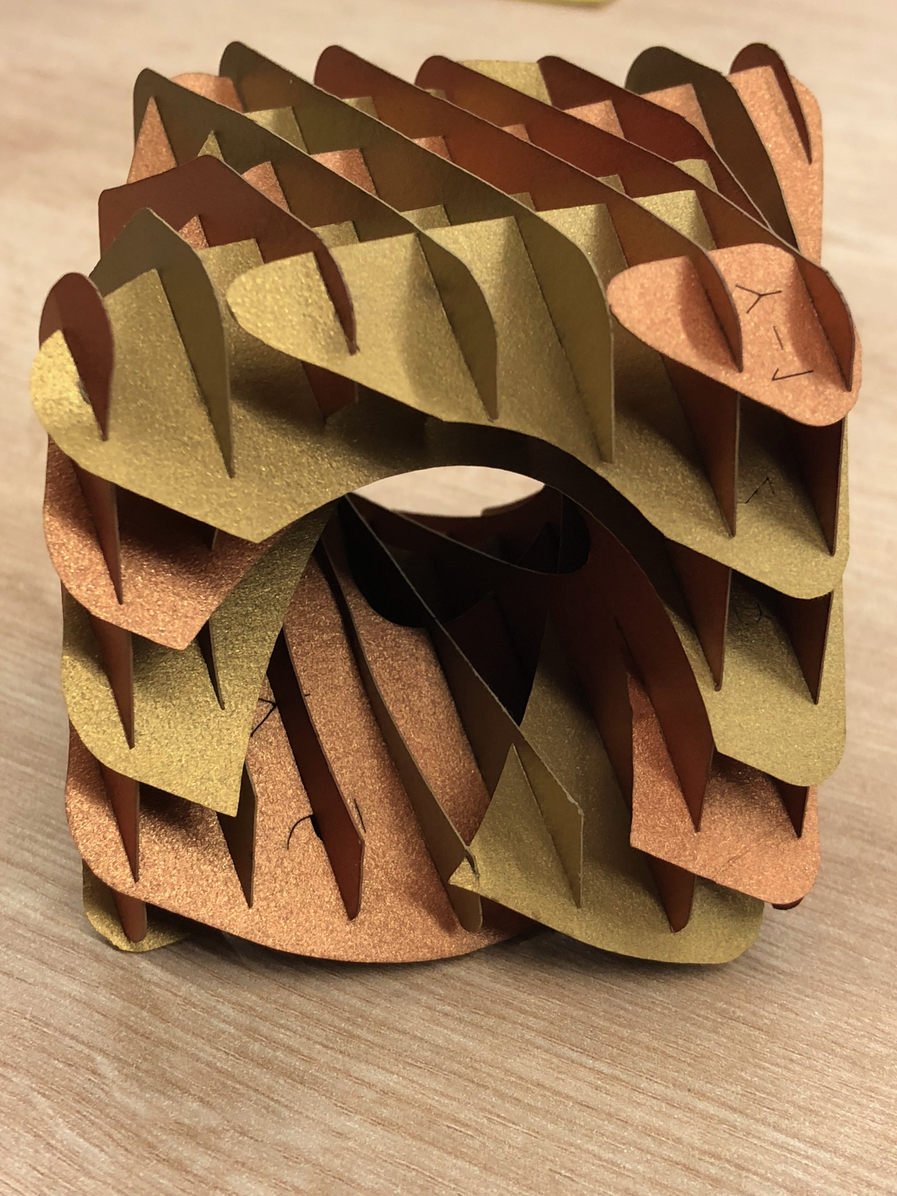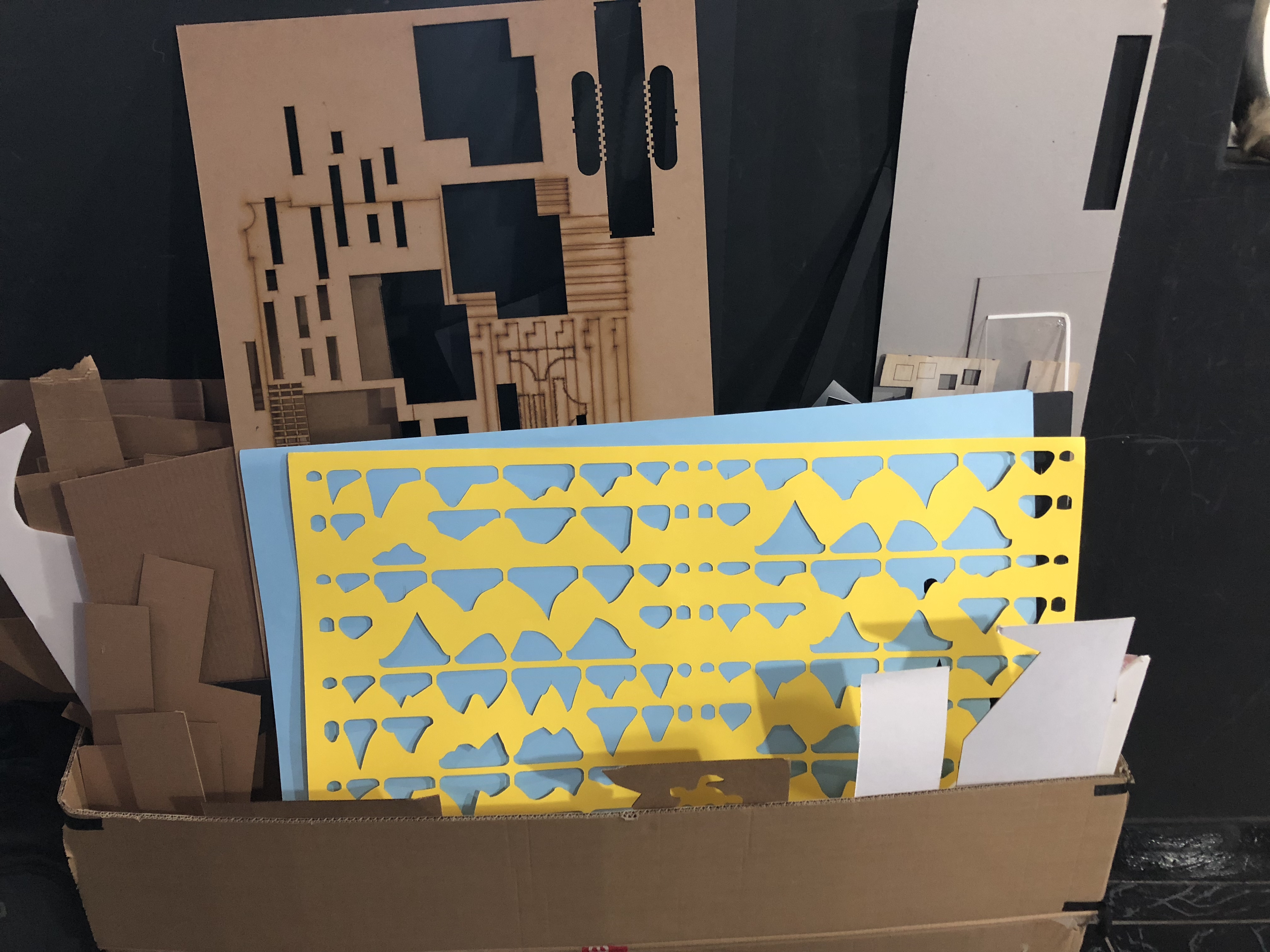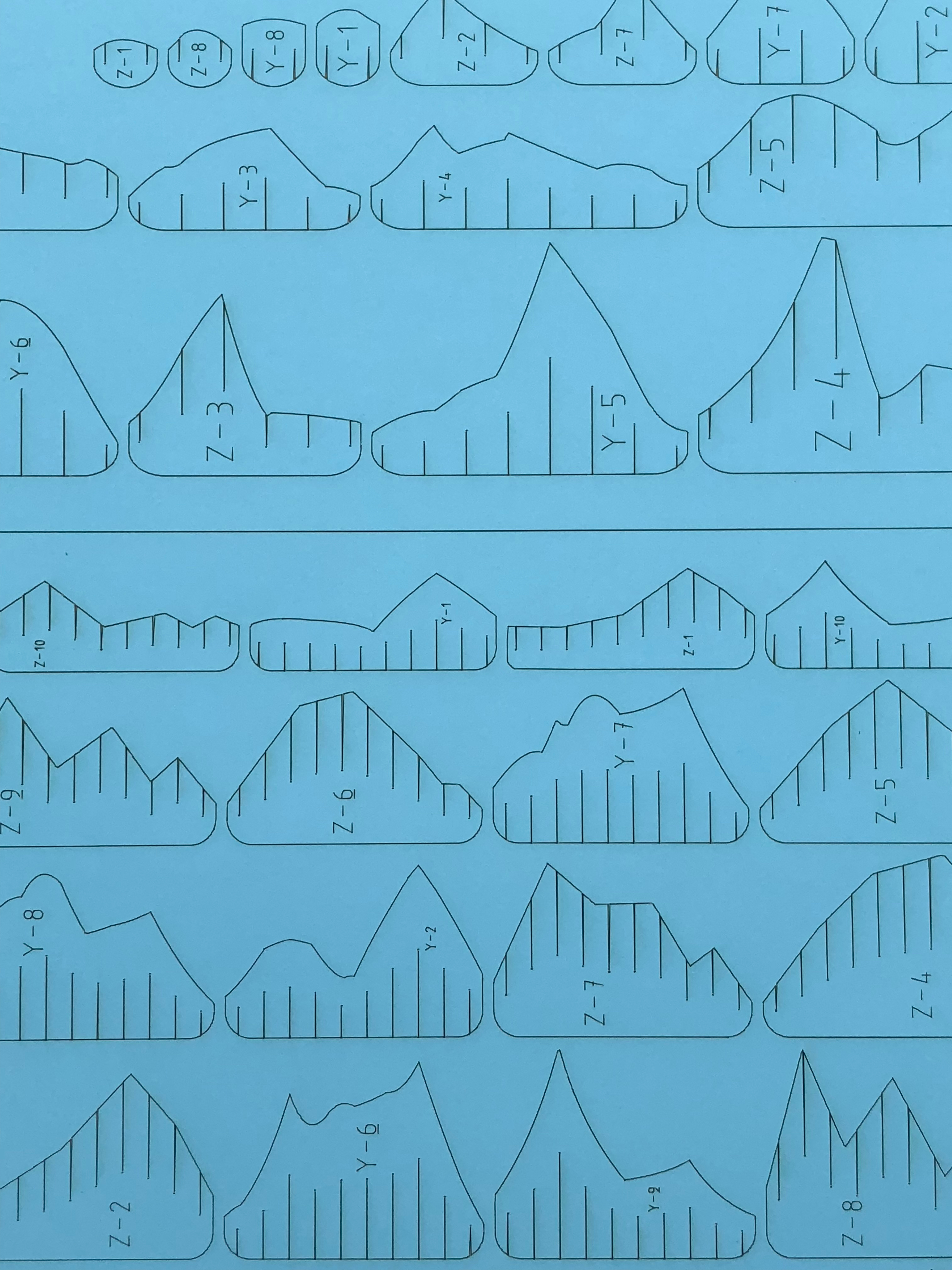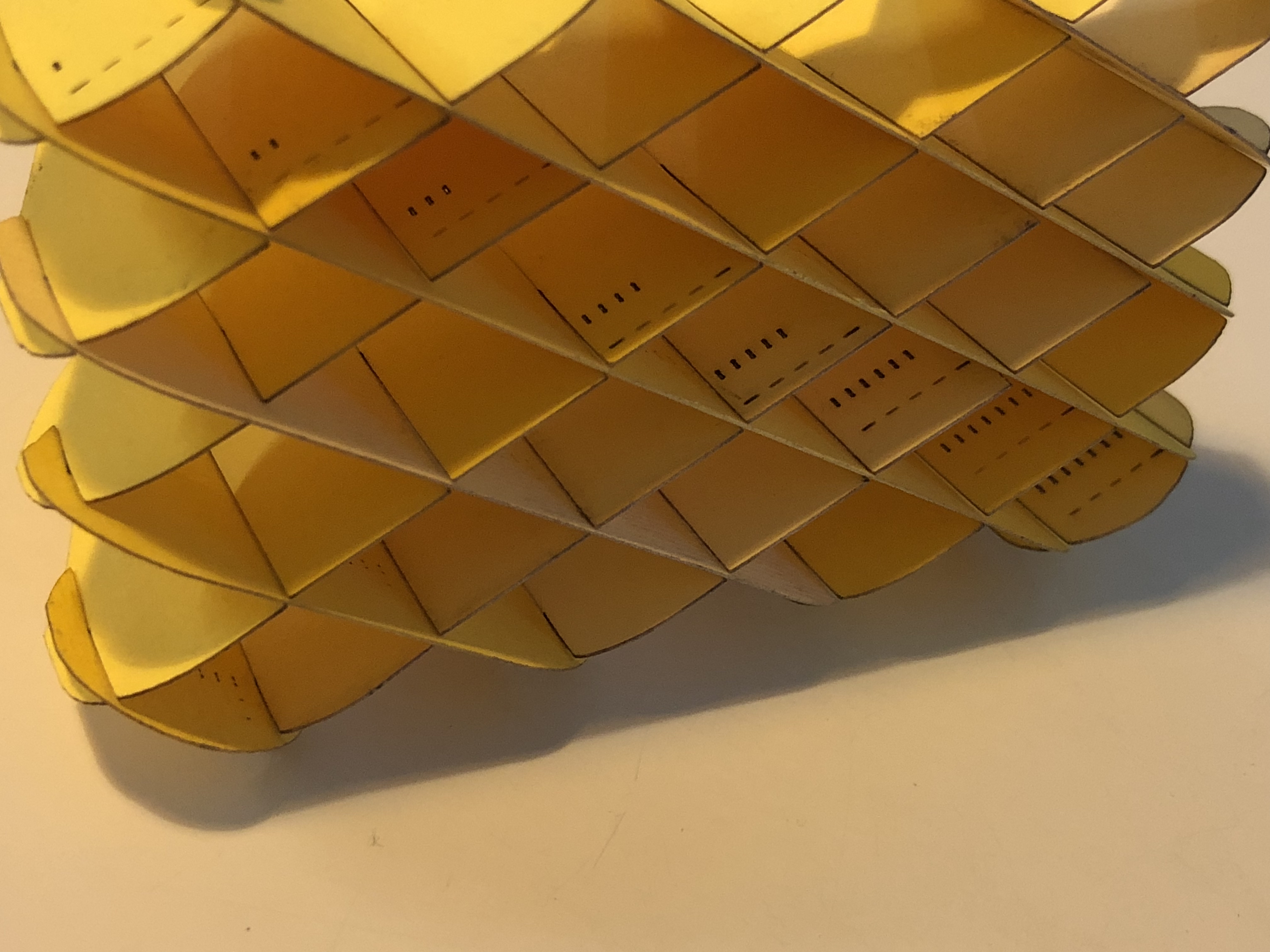 At the time, I had recently left my job to travel and freelance with a creative crew of folks. My friend, Chris, and I were exploring the Atacama Desert of northern Chile, while thinking about this project. The landscape ultimately had a large influence on the designs and color pallet of our artifacts. We chose origami as the unique physical artifact, it has a hand-assembled quality that emphasizes its uniqueness and physical nature. The experience required 500 pieces of origami, which posed an interesting design challenge for assembly and transportation while traveling. Developing 500 unique and appealing designs alone was tough, ensuring they also met this design criteria added another layer of complexity. Sliceform-origami allowed us to achieve a diverse set of designs we liked, while still packing flat for transportation. The majority of our experimentation and testing took place in Lima, Peru; ESAN University allowed us to prototype with the laser cutter in their fab lab. A small local laser cutting studio in Lima helped us with the massive amount of cutting required. The yellow sheet of paper to the right took about 2 hours to cut and yielded enough for 10 origami pieces.