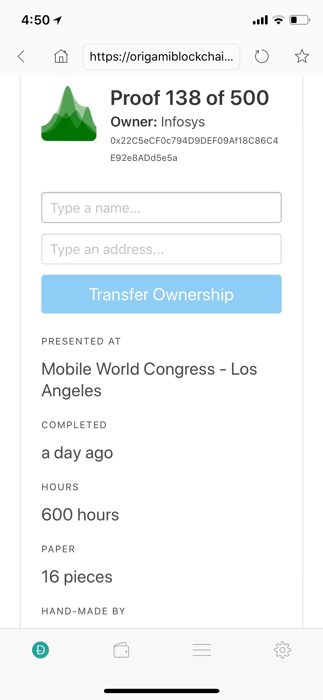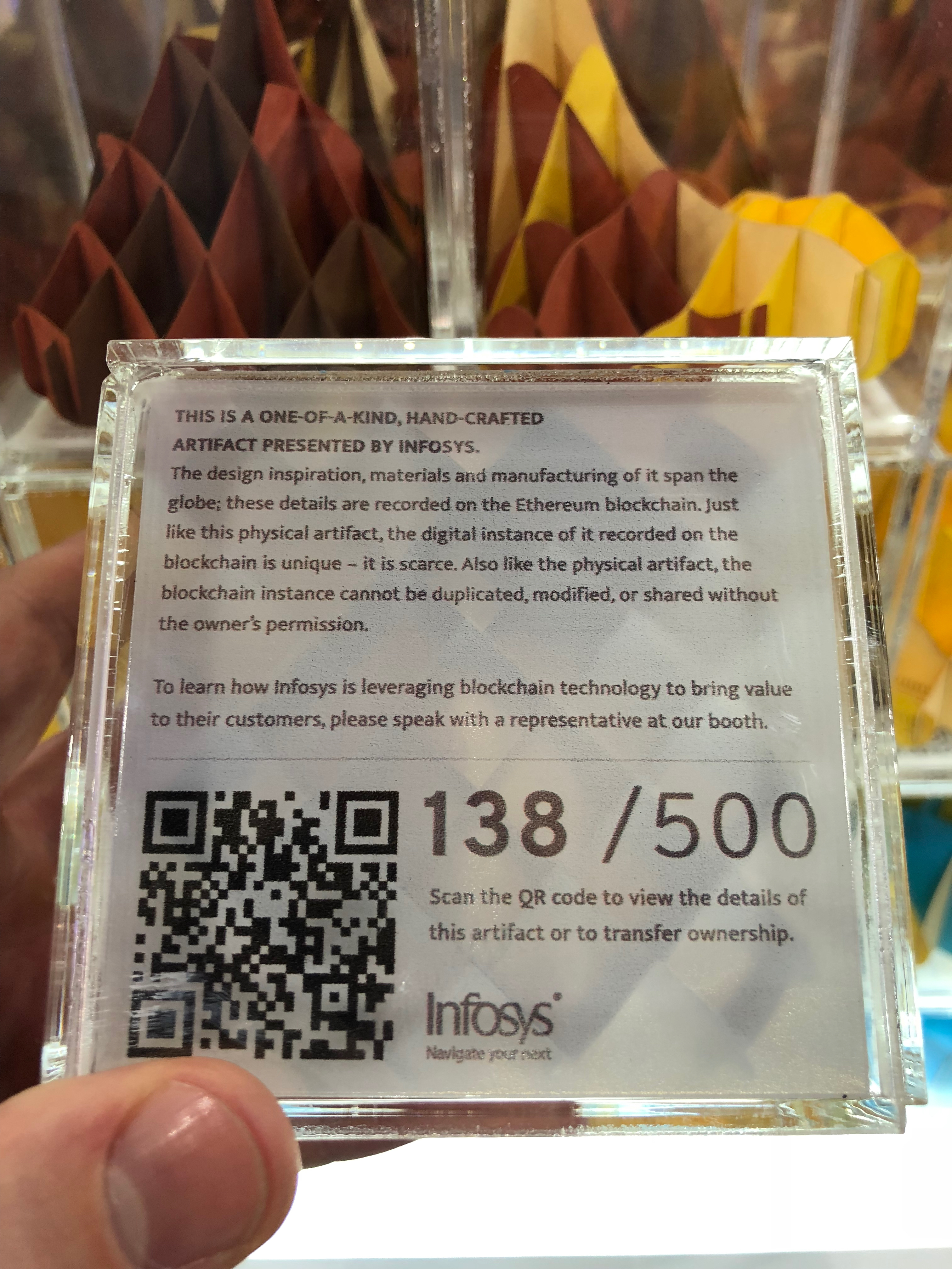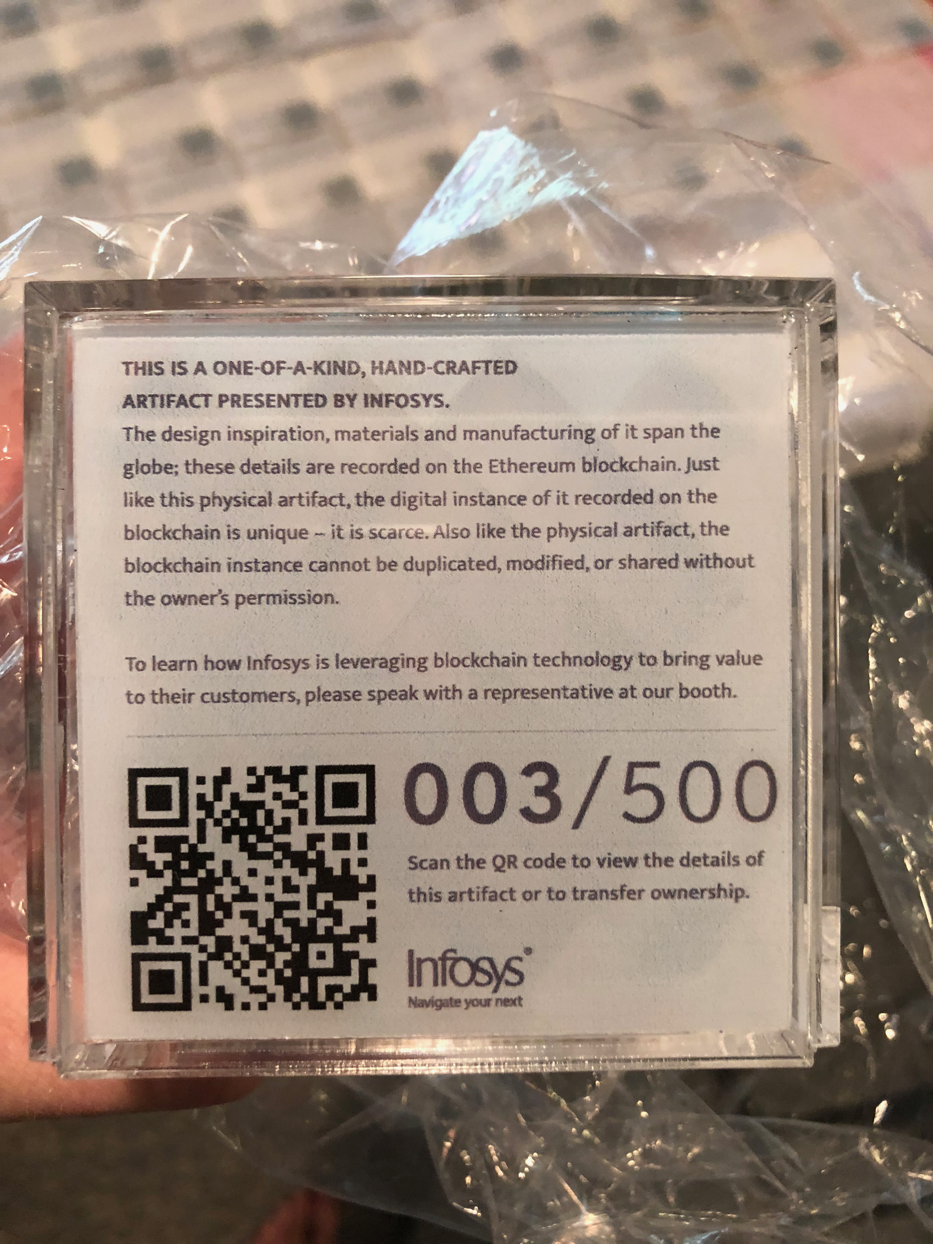 My first stop was Mobile World Congress in Los Angeles, my second was Telstra's Vantage conference in Melbourne. Each time someone visited the display I would transfer the digital ownership of an artifact to them live on the Ethereum blockchain, while handing them the physical artifact. A video of this process can be seen to the right. The experience opened up discussions to digital scarcity and blockchain, separate from cryptocurrency. It was humbling to hear multiple people remarking at the simplicity of the demonstration for such a complex concept. However, not all was smooth - there were plenty of questions regarding web3, transaction time, and wallets, which reminded me how numb and accepting I've become of the UX issues in the blockchain space.