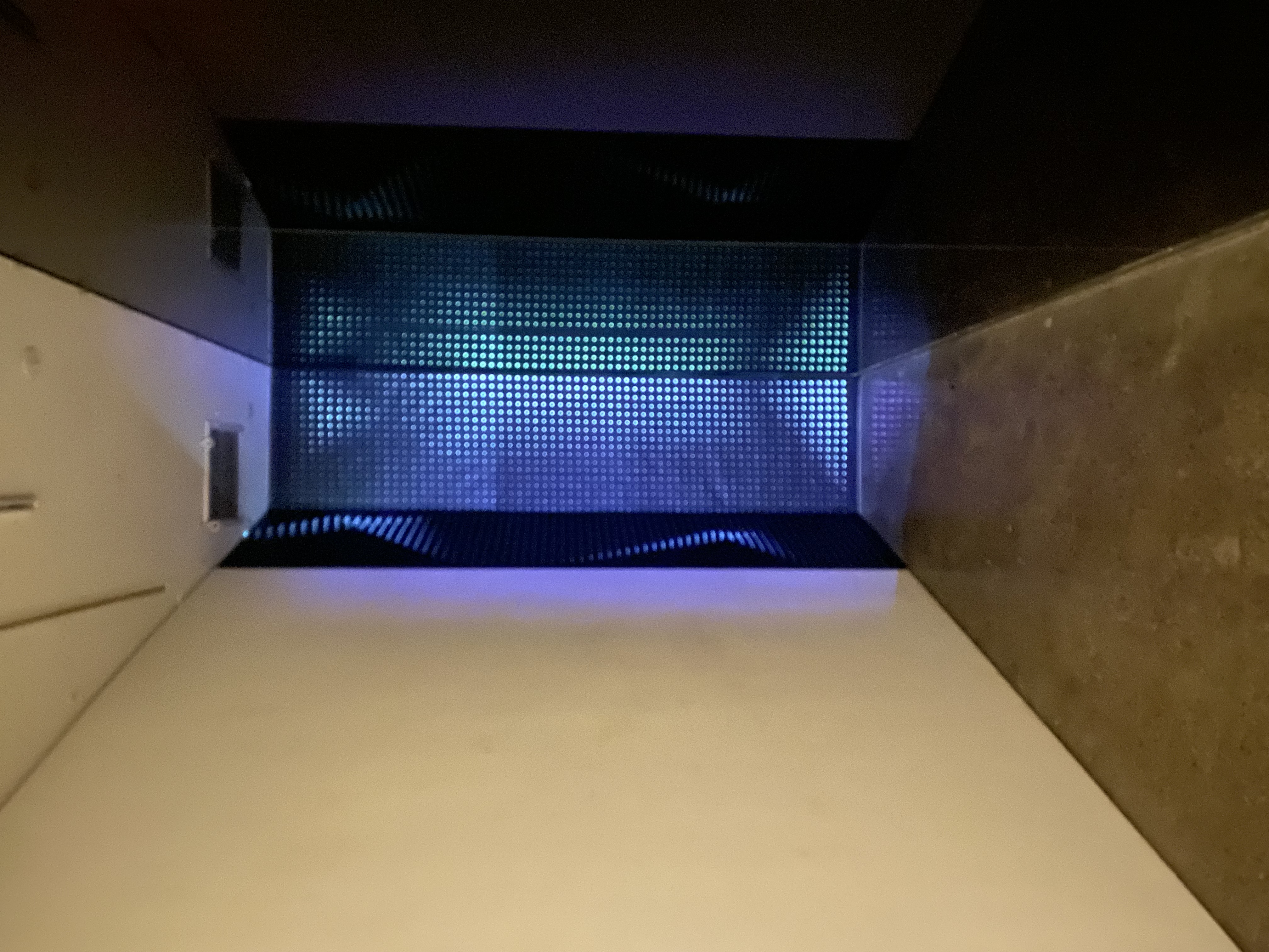 A mirrored wall further amplifies the illusion, introducing a symmetrical extension that visually collapses the boundary between physical and virtual space. Together, these elements generate the sensation of a curved, expanding environment within a rigid architectural enclosure. The work lets viewers experience how spatial perception is actively constructed rather than passively received.