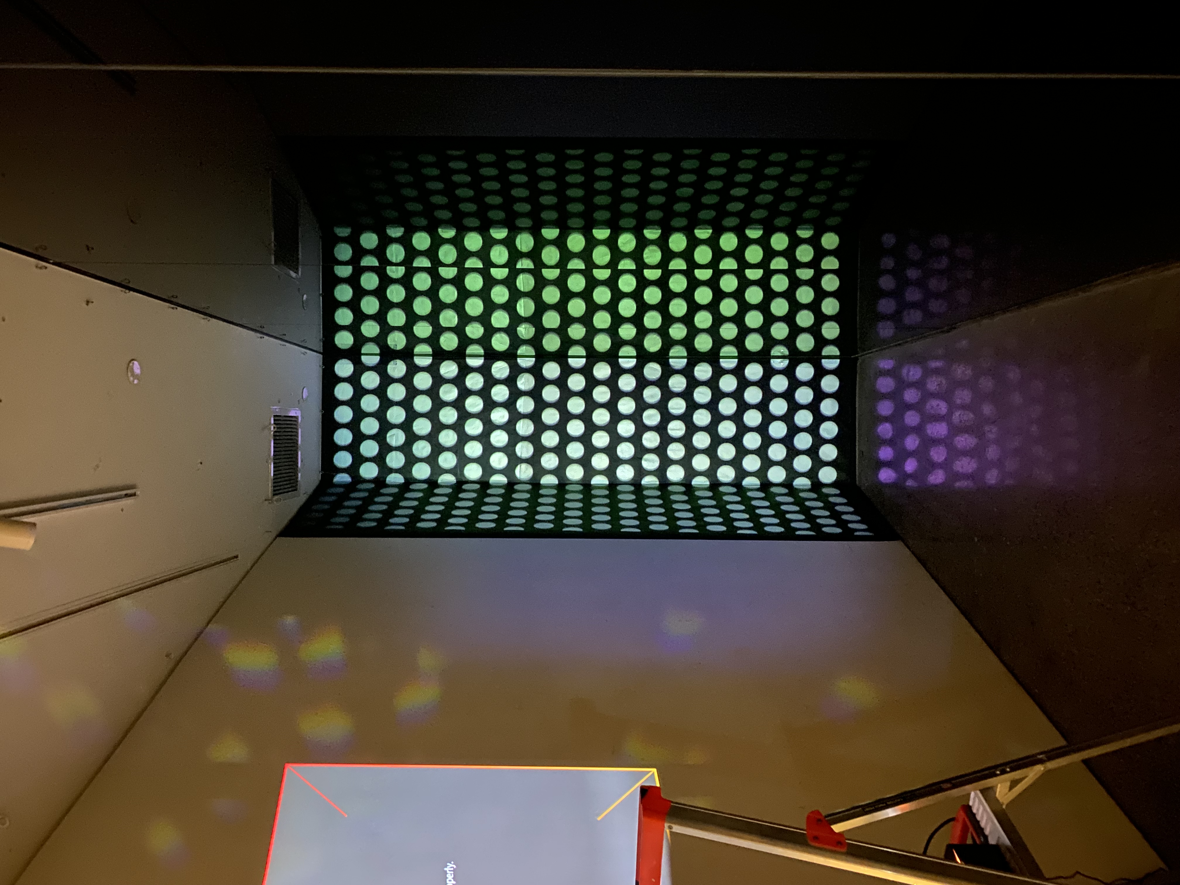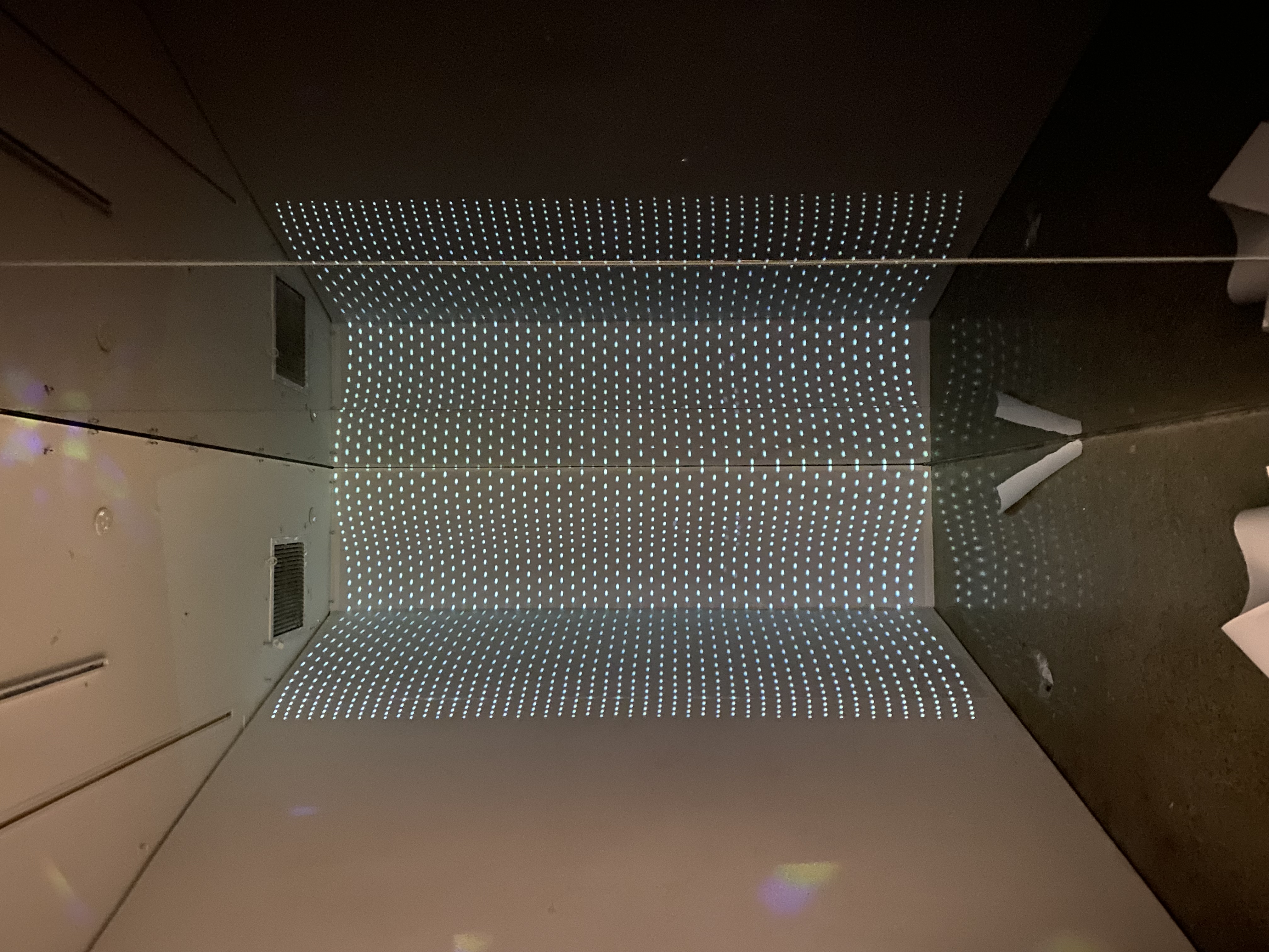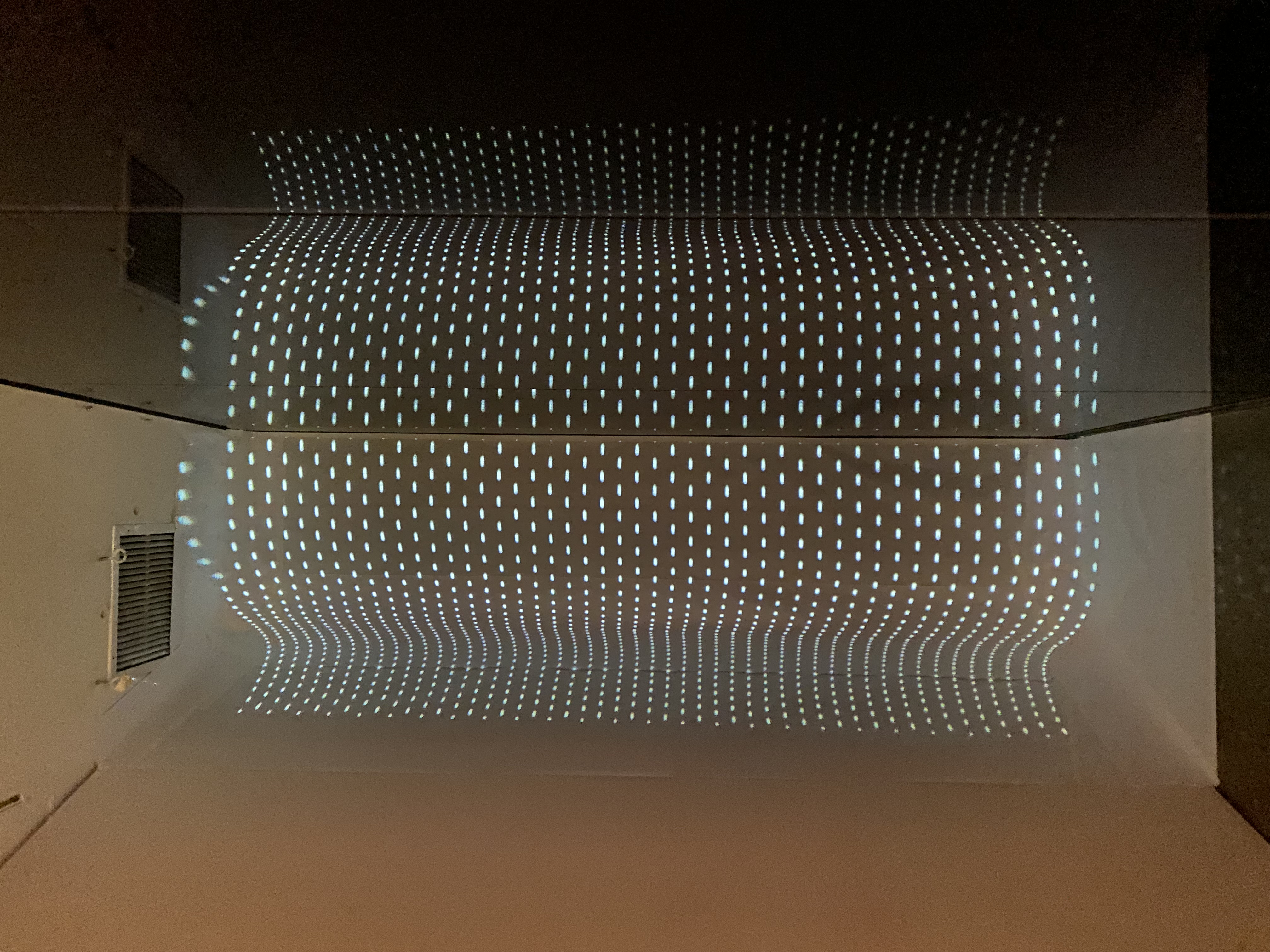 The installation consists of a field of projected points of light mapped across four planar surfaces. These points are arranged in a hexagonal lattice, echoing the structure of rod photoreceptors in the human retina, the cells responsible for low-light vision and sensitivity to contrast rather than color. Through precise control of spacing, motion, and luminance gradients, the projected points produce emergent percepts of curvature, surface continuity, and spatial depth.