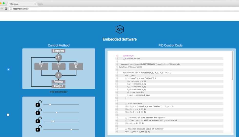 This is an inverted pendulum, a very basic example of an intelligent product. It balances by transferring angular momentum from the spinning reaction wheel to the frame with help from onboard sensors. The most crucial variables involved in this process can be viewed within this "Seeing Space" in real-time. Users can manipulate these variables, capture sensor data, and juxtapose results from different engineering focuses. More complex products, like cars, will occupy spaces similar to NASA’s Mission Control Center, run tests and populate screens with results. Future boardrooms will evolve into similar spaces, where information is dynamic and responsive.